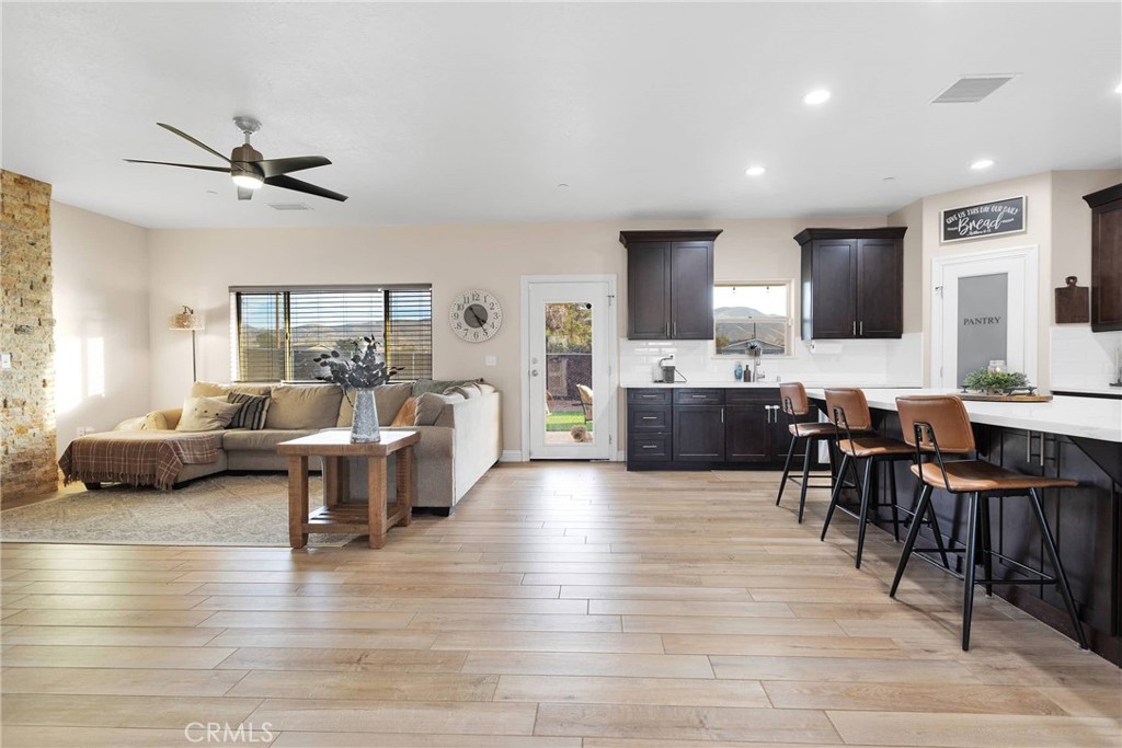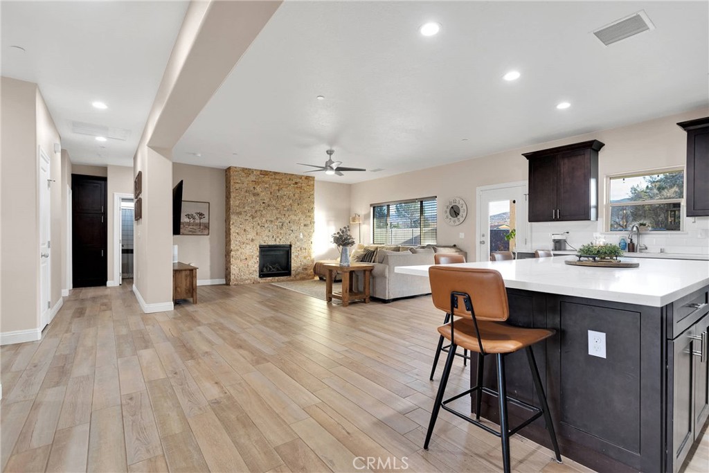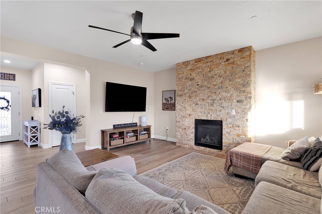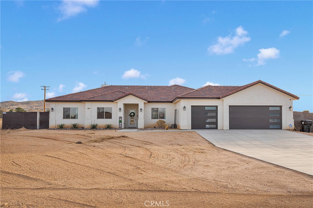 Welcome to 22655 Via Seco Street, a beautifully crafted single-story home in the desirable City of Apple Valley. Built in 2022, this custom residence is set on a sprawling 1.46-acre lot, offering stunning desert vistas and newly landscaped grounds. Inside, you’ll find a spacious and modern layout with 2,174 square feet of living space. The home features four well-appointed bedrooms and two and a half bathrooms, all enhanced by abundant natural light from oversized windows and solid doors. The open-concept kitchen is a chef’s dream, complete with custom cabinetry, a large island topped with quartz countertops, and a chic subway tile backsplash. Stainless steel appliances, including a gas range and oven, complement the space, along with a convenient walk-in pantry. The kitchen flows effortlessly into the living room, where 9-foot ceilings and a cozy fireplace set against a stone veneer wall create a welcoming atmosphere. The master suite offers a serene escape with a luxurious bathroom featuring a walk-in shower, double sinks, and a spacious walk-in closet. Energy-efficient windows and a whole-house fan enhance comfort throughout the home. Outside, enjoy the convenience of a three-car garage and ample driveway space, perfect for parking vehicles, boats, or an RV. The backyard is beautifully designed with modern landscaping and high-quality artificial turf. This home also includes a washer/dryer in-unit, air conditioning, and paid-off solar panels, ensuring both comfort and sustainability. Experience the perfect blend of modern living and natural beauty in this exceptional Apple Valley home.