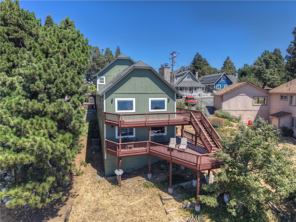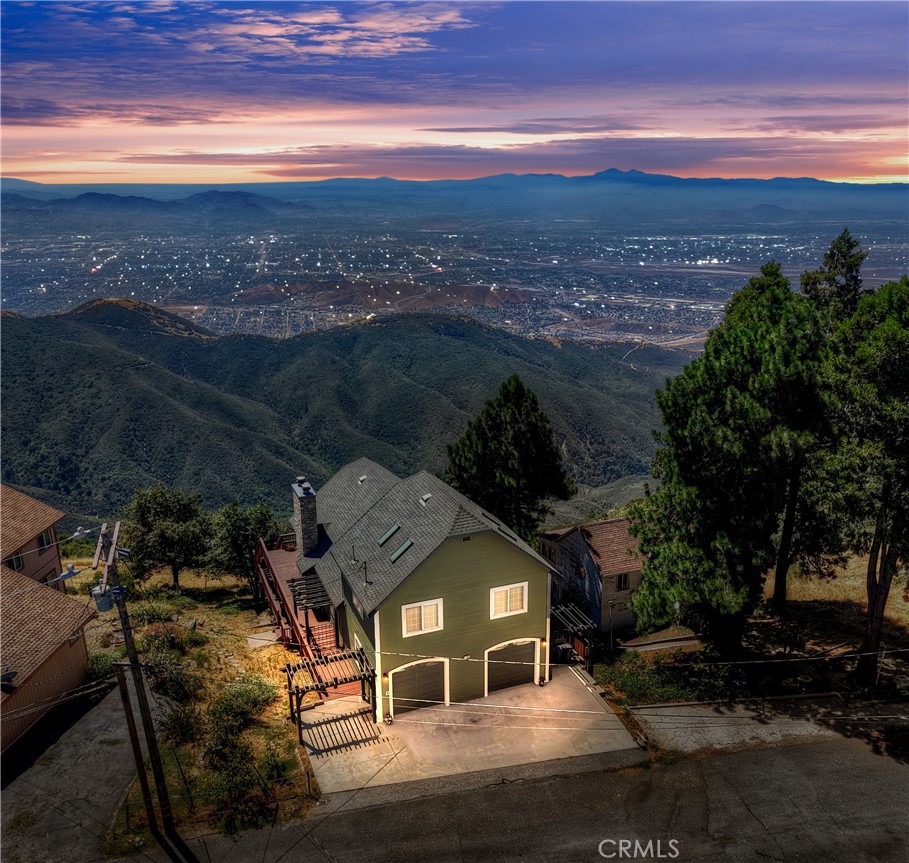Exceptional custom built 4 bedroom, 3 bath home in the coveted Skyland area of Crestline with stunning panoramic valley, city lights and sunset views and features that truly set it apart. Perched where birds and hang gliders soar giving a daily back-drop of natural beauty. With level entry into the home and a thoughtfully designed floor plan with two bedrooms and a full bath on the main level—perfect for guests or multi-generational living. You’ll find not one, but two spacious primary ensuites, each on its own level for ultimate privacy and comfort. Each suite is accompanied by its own dedicated laundry area, with one conveniently located just outside the main master and the other next to the second suite. The interior showcases warm tongue and groove vaulted ceilings, rich wood and tile flooring, and two cozy fireplaces—one in the inviting living room and another in the lower-level primary suite. Enjoy cooking in the stylish kitchen with stainless steel appliances or relax and unwind on two expansive entertaining decks perfectly positioned to take in the jaw-dropping views. Additional amenities include central A/C, a two-car garage, tons of storage, and an extra-large build-up area—ideal for future expansion or a home workshop. Situated on a county-paved, snow-plowed, and maintained road, this home offers a serene mountain lifestyle with excellent commuter access. Don’t miss this rare opportunity to own a truly special property with some of the most stunning views in the San Bernardino Mountains. Whether you’re seeking a full-time residence or a peaceful second home, this one checks all the boxes—and then some.