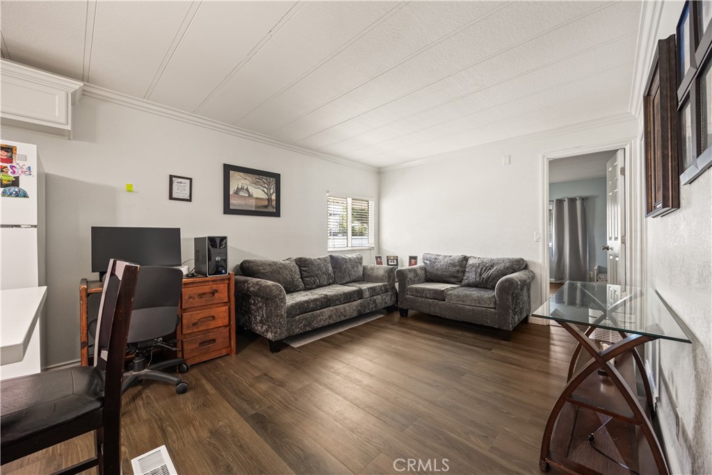 Beautifully remodeled 3 bedroom, 2 bath manufactured home located in the charming small town of Nuevo. This inviting home offers a bright open-concept kitchen and family room, complemented by a separate living room and formal dining area with built-in cabinetry. The fully remodeled kitchen features granite countertops, gorgeous glass tile backsplash extending to the cabinetry, farmhouse sink, white appliances, and premium finishes throughout. The spacious primary suite includes a private bath with relaxing garden tub and separate shower. Two additional well-sized bedrooms provide flexibility for guests, family, or home office use. Enjoy easy-care front and back yards, mature palm trees, covered front patio with privacy lattice, and ample covered parking. Two storage sheds offer additional convenience. Major upgrades completed in 2020 include vinyl windows, remodeled kitchen and bathrooms, premium vinyl flooring, new ducting for HVAC system , and updated interior gas piping. Additional recent improvements include a new roof (approximately six months old) and leased solar system for energy efficiency.