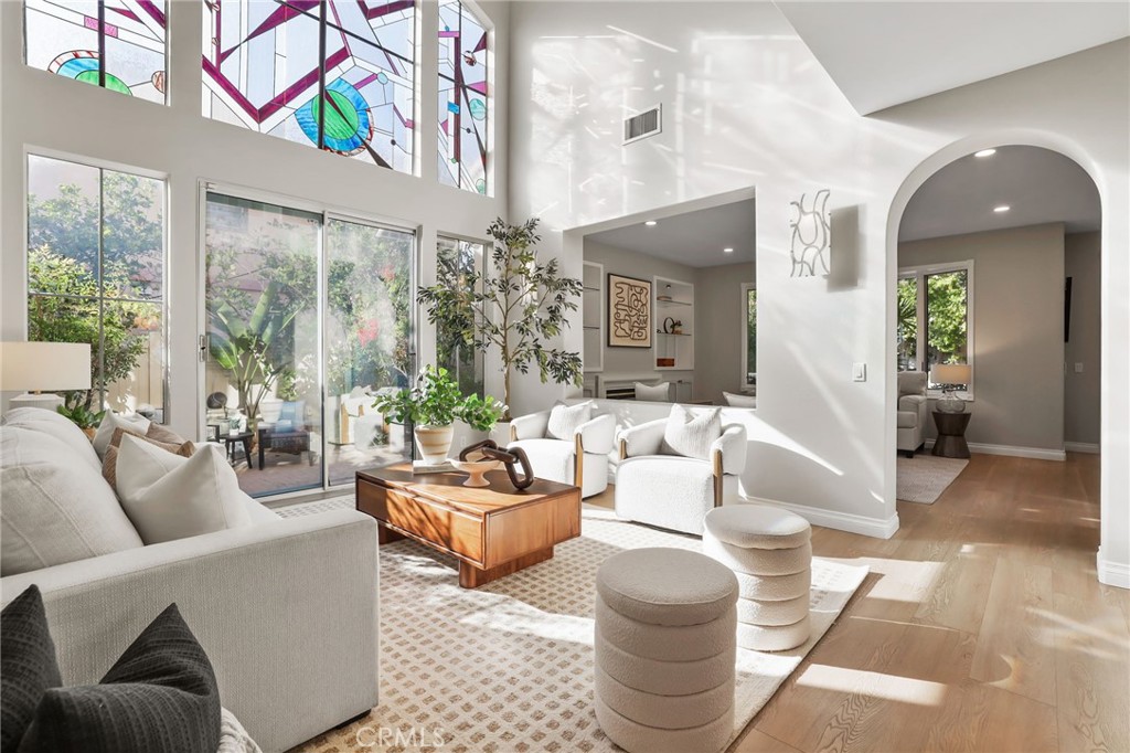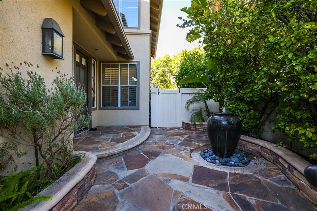 Located on one of the largest lots in the prestigious 24-hour guard-gated community of San Miguel in Tustin Ranch, and within walking distance to the elementary school, this stunning home offers soaring ceilings, abundant natural light, and beautifully updated interiors throughout. The dramatic living room features custom stained-glass windows and two-story ceilings, creating an impressive yet inviting space. The warm family room with built-in shelving and a cozy fireplace flows seamlessly into the remodeled chef’s kitchen, complete with quartz countertops, a large center island with gas cooktop, stainless steel appliances, custom cabinetry with glass display panels, and generous storage, perfect for everyday living and entertaining. A sun-filled, glass-enclosed sunroom provides a tranquil retreat for dining or relaxing while enjoying views of the lush backyard. The spacious primary suite boasts vaulted ceilings, plantation shutters, and a spa-inspired bath with soaking tub, walk-in shower, dual vanities, and designer finishes. Two well-appointed guest bedrooms offer comfort and flexibility, complemented by a dedicated office ideal for remote work. The updated guest bath features modern cabinetry and a sleek glass-enclosed shower. Step outside to your private, park-like backyard featuring mature trees, a built-in BBQ island, expansive patio, fire pit seating area, and beautifully landscaped grounds. A charming side yard with fountain and garden pathway adds additional outdoor living space. Additional highlights include a two-car garage with direct access, epoxy floors, and built-in storage. San Miguel residents enjoy a resort-style pool and spa. Conveniently located near award-winning Tustin Unified schools, Tustin Ranch Golf Course, The Marketplace, The District, Peters Canyon Park, hiking and biking trails, and easy access to the 5/55 freeways and 241/261 toll roads. This is a must-see home!