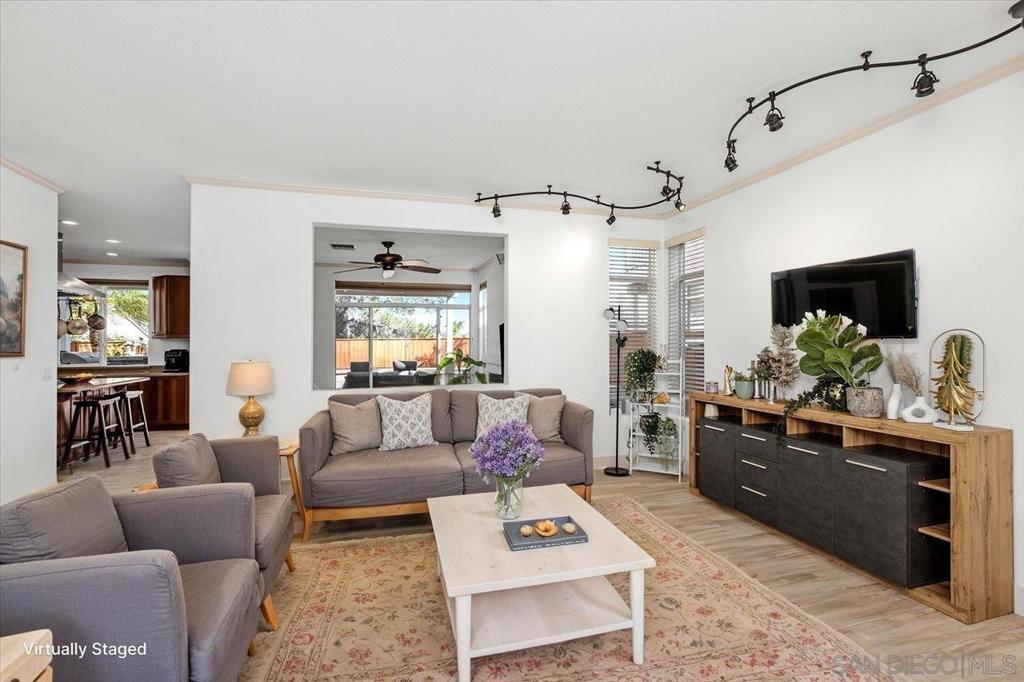 This home has main character energy. Even though it’s located in Escondido, it’s zoned for the award winning San Marcos School District . Set in the24/7 guard gated community of Emerald Heights, this 4 bedroom 3 bathroom stunner also includes an optional fifth bedroom currently used as a spacious loft, perfect for a playroom, office, or upstairs lounge space where the kids can be loud and the adults can pretend not to hear it. It has the space, upgrades, and lifestyle perks you’ve been manifesting. Downstairs has been completely refreshed with brand new luxury vinyl plank flooring, new light fixtures, and new windows that let the sunshine pour in like it’s being paid to. The kitchen opens right into the family room and out to the backyard where a peaceful water feature and relaxing spool are waiting to elevate your weekends. Upstairs you’ll find four legit bedrooms, the loft, and two full bathrooms. Newer paint and carpet keep everything feeling fresh. Leased solar keeps things efficient and affordable. The dining area brings the drama with a showpiece light fixture, ready for everything from takeout nights to holiday dinners. Living in Emerald Heights means access to an Olympic size pool, spa, toddler pool, renovated clubhouse and gym, tennis and basketball courts, on site management, and nonstop community events. Think Music at Sunset, pool parties, holiday events for kids and grown ups, Easter with the Bunny, casino night, and more. Basically it’s hard not to make friends here. This is the kind of home that doesn’t come around often.
