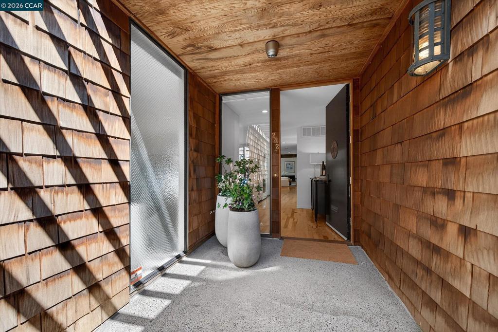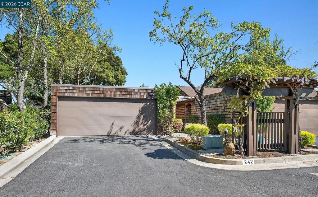 Rarely available single level living in sought-after Orindawoods. Ideally positioned for privacy & abundant natural light, this serene residence offers a seamless blend of comfort, style, & connection to nature. Soaring vaulted, beamed ceilings & walls of glass create an airy, open feel, while four sets of sliding glass doors invite the outdoors in—framing picturesque views of mature oak trees & surrounding greenery. Designed for effortless California living, the home is bright, sunny, & perfectly suited for both everyday living and relaxed entertaining. Warm hardwood floors & a gas fireplace add character and sophistication. The thoughtfully designed layout includes a spacious primary suite featuring a sliding glass door, custom shades, & beautifully updated bathroom with double vanity, large shower, & sleek Grohe fixtures. The secondary bedroom offers its own ensuite bath and outdoor access—ideal for guests or a home office. Outdoor living is equally inviting, with a wraparound deck showcasing contemporary glass-paneled railings and a private courtyard patio beneath a wisteria-draped trellis. Two-car garage with interior access. Coveted Orindawoods lifestyle, with community pools, tennis, BART shuttle and convenient proximity to downtown Orinda & top-rated schools.