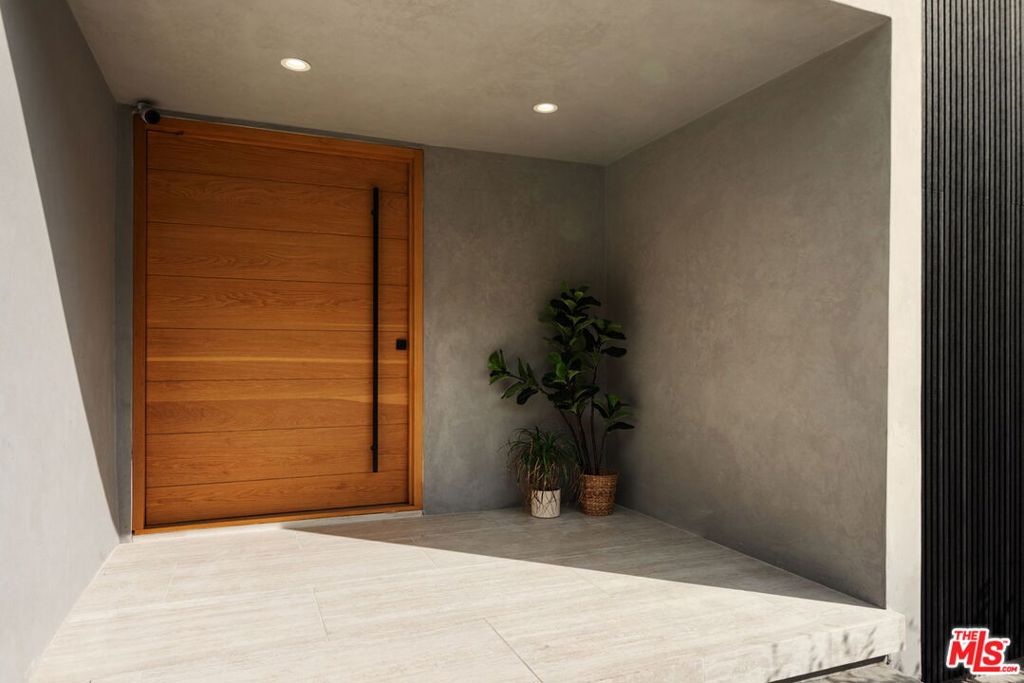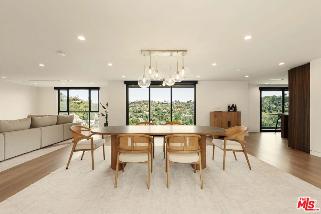 Located in the coveted Mount Olympus neighborhood of the Hollywood Hills, this completely remodeled 4-bedroom, 4.5-bath modern home offers spectacular city and canyon views in a serene setting. The open floor plan is designed for both everyday living and entertaining, featuring a gourmet kitchen with all Miele appliances, a built-in espresso machine, custom Italian cabinetry by Molteni & C, and Taj Mahal marble countertops and a breakfast bar for casual dining. The open floor plan includes a dining area and living room with a fireplace, opening to balconies offering views from every room. The downstairs level opens to a brand-new deck with a spa, fire pit, and outdoor kitchen complete with a built-in BBQ, cooktop, refrigerator, and new teak furnishings. There is a den/ office and a steam shower to use after a workout in your own personal gym. All main bedrooms are located on the top level – primary suite and secondary bedrooms feature custom walk-in closets, while spa-inspired baths include high-end stone finishes and heated floors. Additional highlights include real hardwood floors, built-in Sonos speakers, motorized Lutron shades, a workout room, movie theater/media room, security system, and two electric vehicle charging stations. Prime location in Los Angeles offering privacy and tranquility, yet just moments from the Sunset Strip and city conveniences.