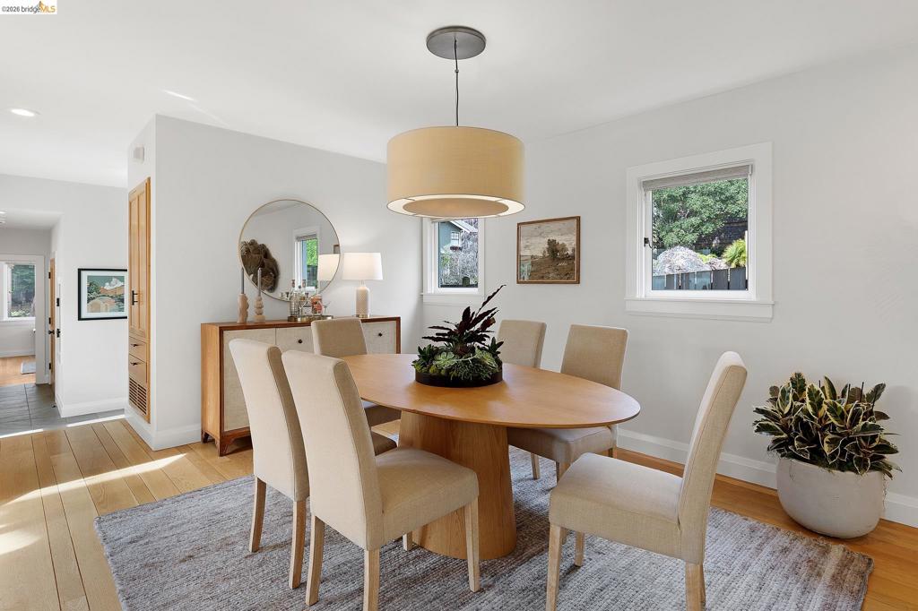 Designed to blur the line between indoors and out, the modern open floor plan creates an effortless setting for both lively entertaining and comfortable everyday life. Vaulted ceilings soar above sun-drenched interiors. Every room feels connected to the enchanting grounds. The spacious living room features a wall of windows framing lush greenery, while the adjoining dining room is ideal for festive gatherings. The eat-in kitchen, reimagined by a renowned local designer, enjoys a large island with counter seating, built-in breakfast nook, and stainless appliances including a 36″ Wolf range and Sub Zero fridge. 2 bedrooms, shared bath and powder room complete the main level. Multiple French doors open to a private courtyard for dining, play, or relaxation. Upstairs, retreat to a luxurious primary suite with light-filled sitting room and spa-inspired bath offering heated floors, soaking tub and walk-in shower. The landscaped garden, featured in “The Beautiful Edible Garden”, includes citrus, berries, succulents, a studio, and a 2-story playhouse. There’s an attached 2-car garage with interior access, wine storage, and bonus space – your home gym awaits. The convenient location is just a few blocks to Village Market and Terrace Café and close to Rockridge shops, restaurants and BART.