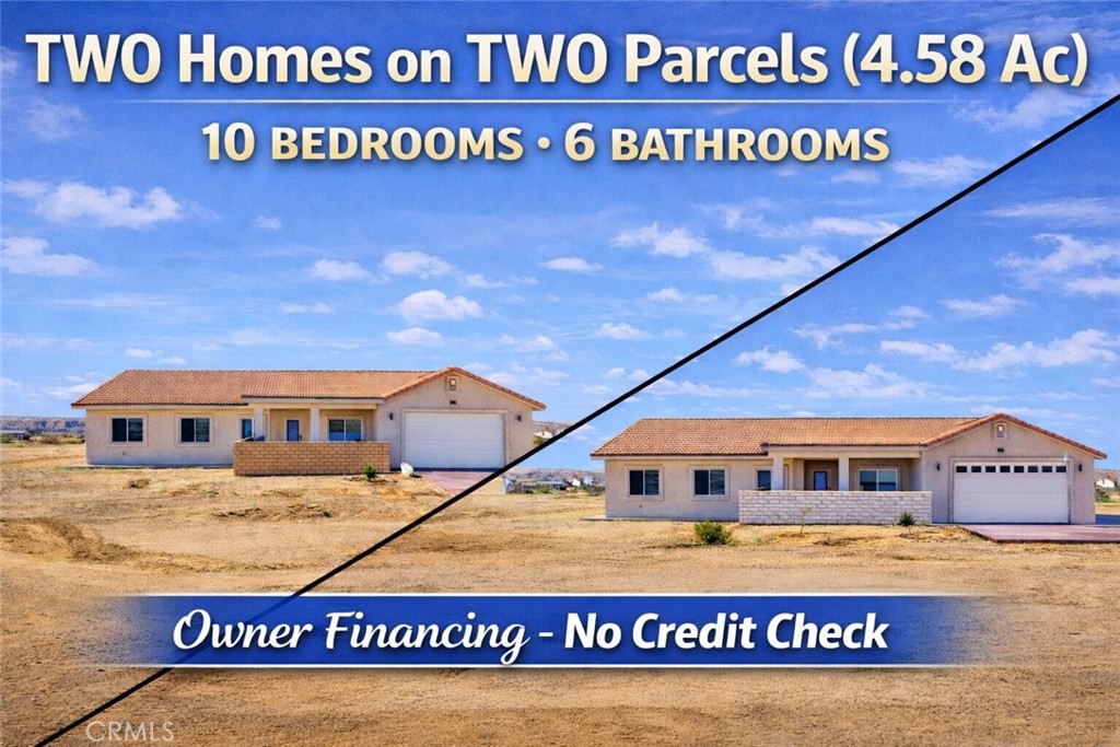 Owner Financing Available | Two Homes on 4.58 Acres – No Credit Check! Seller may carry the mortgage, no credit check required, offering flexible terms including interest-only or 30-year amortization. This unique offering includes two separately deeded, adjacent parcels with a shared 330-foot property line. Each parcel is 2.29 acres, totaling 4.58 net acres, and is Rural Living zoned, ideal for multi-generational living or a self-sufficient lifestyle. RL zoning allows for horses, goats, cows, chickens, etc. The property features two homes totaling 10 bedrooms and 6 bathrooms, including 4 primary suites. Both parcels are fully fenced and each homes is serviced by its own private well, each producing 10 acre-feet of water per year, with no water meters or usage fees beyond power to pump. Approximately 80 mesquite trees are planted with automatic irrigation. County zoning allows two ADUs per parcel, creating potential for additional units and expanded living space. Both homes are super-efficient, all-electric with expandable and fully paid for solar systems and Tesla Powerwall 3 batteries that include power outage protection. The systems are designed for potential off-grid living while remaining connected to Edison. Construction highlights include R-48 ceiling insulation, 2×6 walls with foam insulation and full stucco exteriors and eves with no wood to paint ever! Front patio and full length back patio provide ample space to relax. Interior finishes include fully insulated interior walls, porcelain tile flooring throughout, quartz countertops and window sills, solid-core custom doors, Kohler fixtures and fully insulated garages. Each room is equipped with a fire suppression system and room-by-room climate control via high-efficiency mini-splits. The kitchen is designed for both functionality and efficiency, featuring a spacious island, cabinetry with convenient slide-out shelving, and a high-performance induction range. A large glass-door pantry with a built-in freezer provides ample storage and adds to the kitchen’s thoughtful, modern design. The Oro Grande School District serves the community with a focus on personalized learning and academic achievement across its elementary and middle schools including the highly desired Riverside Prep (Elementary, Middle and High Schools). The seller is offering to install an automatic opener for the custom entry gate with acceptable pricing and financing.