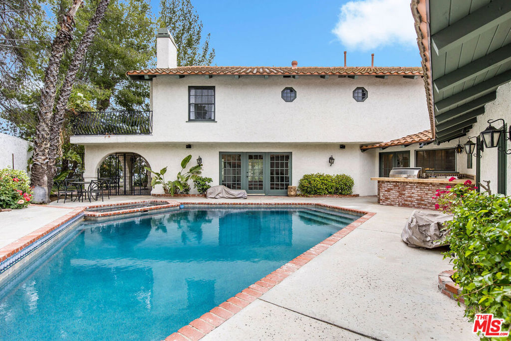Perched on a secluded promontory in Hidden Hills, this private hilltop estate offers exceptional privacy and expansive panoramic views. Accessed by a long, tree-lined driveway, the Mediterranean-style residence is filled with natural light and designed for seamless indoor-outdoor living.The home features 5 bedrooms and 3.5 bathrooms, with a well-planned layout ideal for both everyday living and entertaining. A dramatic two-story rotunda entry leads to formal living and dining rooms with multiple French doors opening to outdoor terraces. The chef’s kitchen is equipped with Sub-Zero and Viking appliances, generous island seating, and direct flow to the main living spaces.The family room includes a wet bar, fireplace, coffered ceilings, and custom paneling. Upstairs, the primary suite offers a fireplace, sitting area, spa-style bath, two walk-in closets, and a private balcony with sweeping jetliner views. Two additional en-suite bedrooms complete the upper level.The lower level includes a guest suite and an additional bedroom or office, each with separate entrances, providing flexibility for guests or work-from-home use. The former corral has been converted into a landscaped yard, offering additional outdoor space and potential.Conveniently located, this property combines privacy, views, and accessibility in one of Hidden Hills’ most desirable settings.