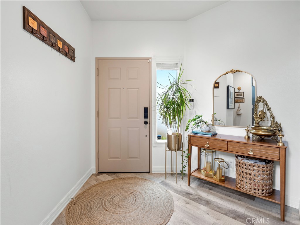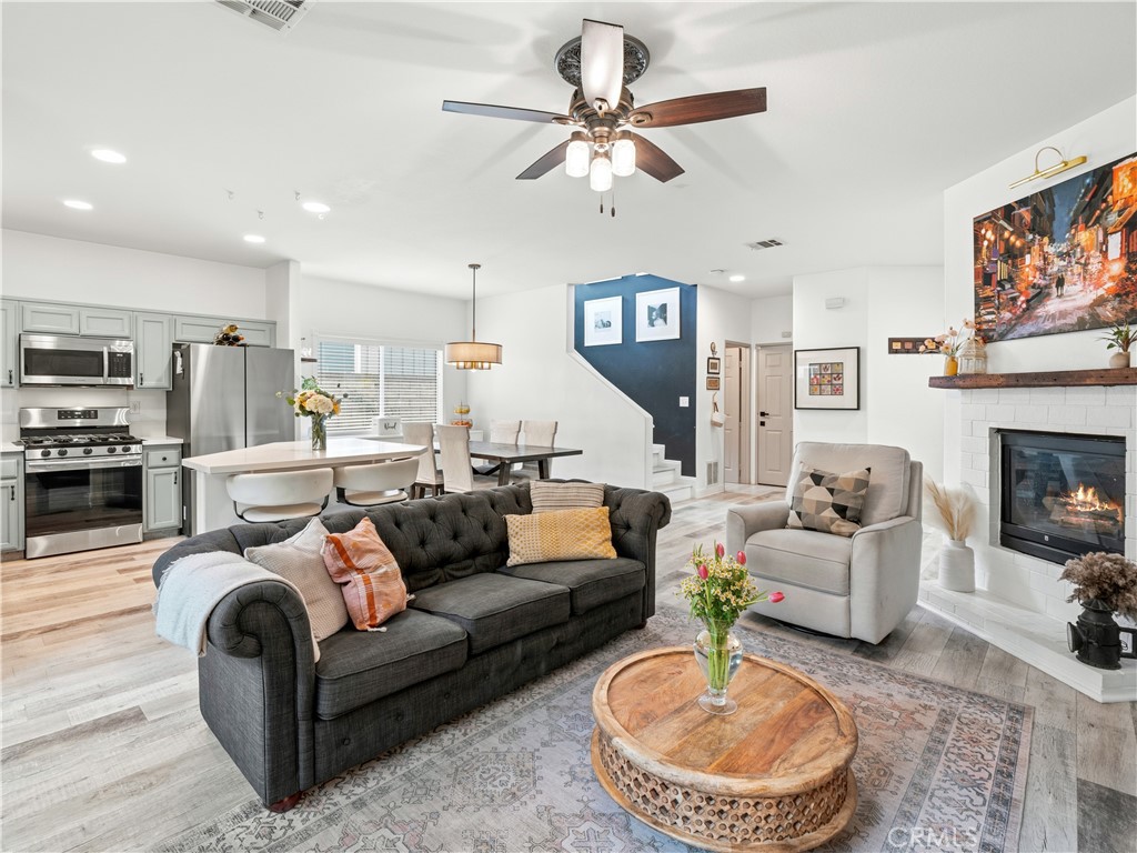 Adorable, trendy 4 bed + 3 bath home in the heart of Newhall near Main Street Newhall, offering over 1,800 sq ft of living space, paid solar, low HOA, and no Mello-Roos taxes with easy access to both the 5 and 14 freeways. This stylish home features a beautifully upgraded kitchen with modern cabinetry, a center island, white quartz countertops, and stainless steel appliances, seamlessly opening to the dining and living areas. The inviting living room showcases a cozy white brick fireplace with mantle, while a charming powder room with designer wallpaper adds a trendy touch downstairs. Upstairs, the spacious primary suite offers a wood accent wall and an upgraded ensuite with dual sink vanity, a stunning glass-enclosed walk-in shower, and a walk-in closet. Three additional well-appointed bedrooms feature stylish wallpaper accents and share a full bathroom. A thoughtfully designed laundry room with cabinetry and folding table adds convenience. Additional highlights include high ceilings, upgraded flooring, modern light fixtures, ceiling fans, and a 2-car direct access garage. Step outside to a private, adorable backyard with a grass area and manicured trees, creating a peaceful outdoor space. Ideally located near downtown Newhall, enjoy close proximity to the Laemmle Newhall theater, shopping, dining, parks, schools, and convenient city transportation. Don’t let this one slip away!!!