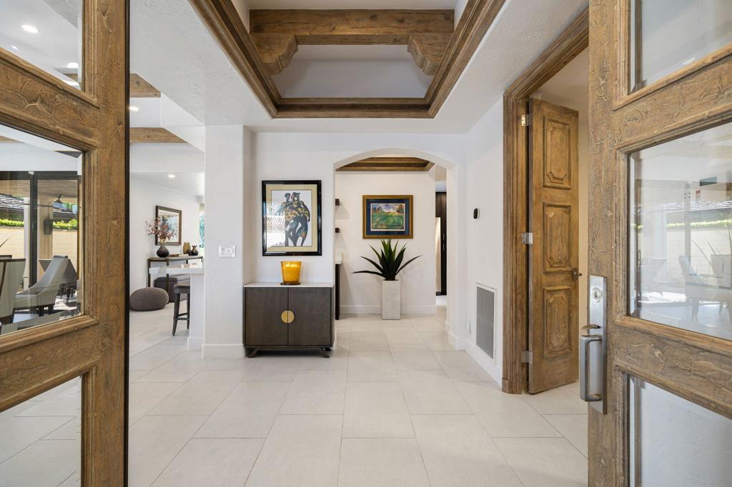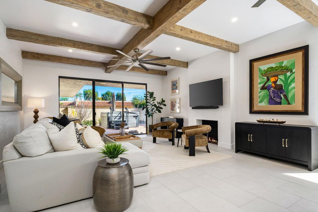 Experience sophisticated desert living in The Springs Country Club with the perfect blend of modern elegance and timeless desert charm in this stunning, updated residence. Situated on the prestigious 3rd hole of the championship golf course at The Springs Country Club, this home boasts coveted south-facing mountain views and a seamless indoor-outdoor lifestyle. This 3 bedroom, 3 bathroom, 2,700+ square foot home is a must see. Extensively updated throughout, the home features a sophisticated palette and high-end finishes. Showcasing striking quartz countertops, sleek dark cabinetry, and premium stainless steel appliances. As you enter through the front door you are greeted by the great room, an architectural masterpiece with massive reclaimed wood beams, soaring ceilings, and a contemporary fireplace, all framed by large-scale tile flooring. The primary and guest bathrooms are designer-curated with floating vanities, vessel sinks, and integrated LED lighting for a true spa like retreat. This home isn’t just beautiful–it’s built for effortless living. Enjoy peace of mind with one newer AC unit and high-efficiency recessed lighting throughout. Step outside to your private patio to take in the panoramic mountain vistas and lush fairway greens. Take a moment to relax and watch the sunset over the 3rd hole, this is desert living at its absolute finest.The Springs Country Club is renowned for its vibrant social scene, the tennis and pickleball facilities, and its recently updated golf course. Take advantage of this moment and envision yourself creating lasting memories here!