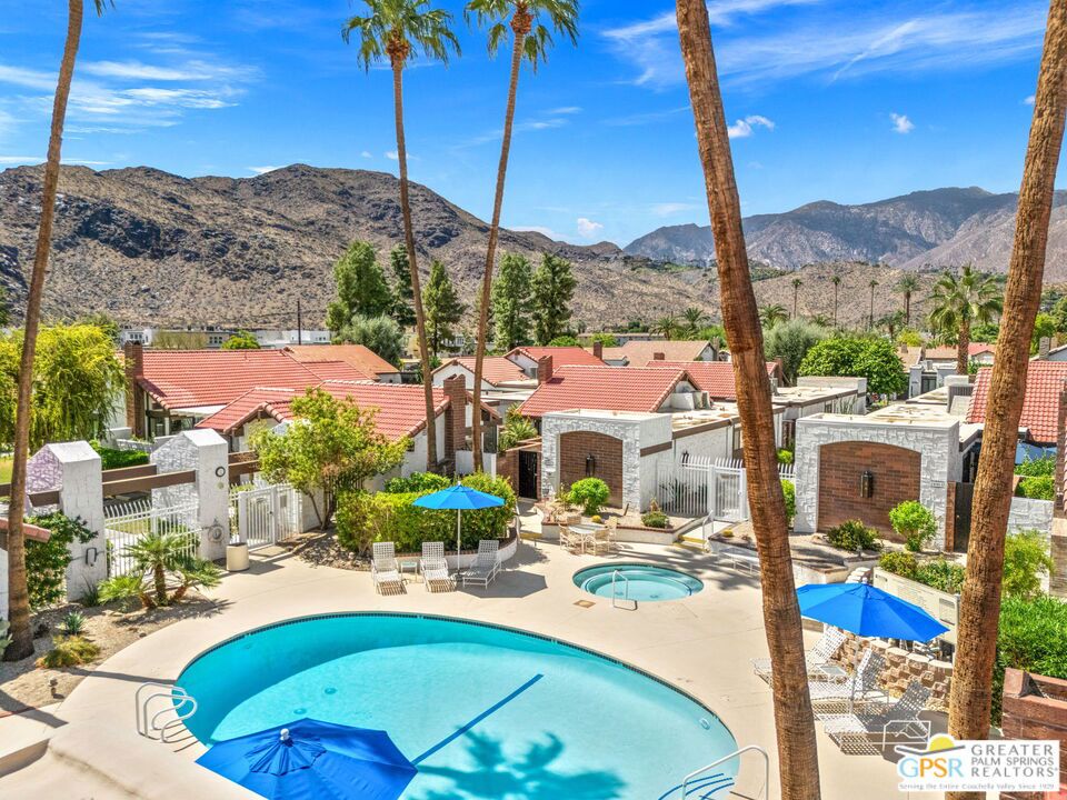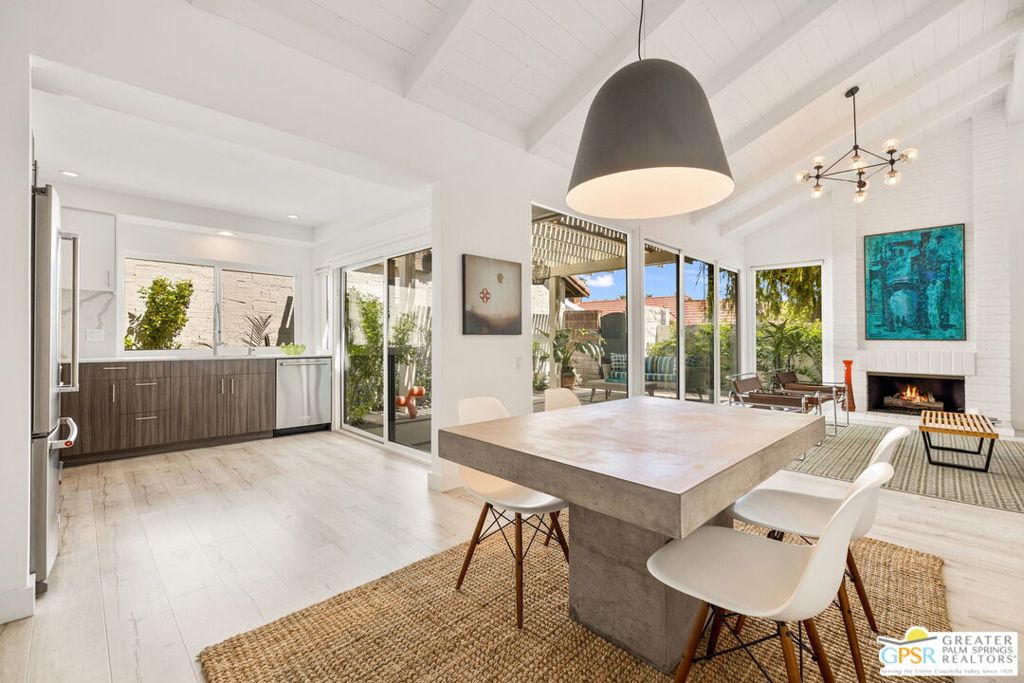 Wow! This Canyon Sands bungalow is pure South Palm Springs MAGIC! Dramatic architectural lines and designer finishes channel the pages of Dwell Magazine, while the living and dining areas are anchored by a bold fireplace that flows seamlessly to the remodeled kitchen and private courtyard where a gate opens to a path that is a short hop to the saltwater pool and spa. A custom bar with wine cooler enhances the dining room, and attention to detail shows throughout with custom cabinetry, quartz counters, fresh paint, striking wallpaper, and dual pane windows and sliders. Both bedrooms are ensuite with the primary suite offering a frosted glass shower wall as a sleek surprise and clerestory windows in the guest bath adding dramatic natural light. Outdoor living is enhanced by a new concrete patio and alumawood pergola. The attached two car garage with direct access includes storage, laundry, and a new tankless water heater, and importantly no walls in the living areas are shared with neighbors, only the garage. Canyon Sands spans 33 lushly landscaped acres with with tennis, pickleball, saunas, and seven sparkling pools and spas. Once home to Gene Autry’s Melody Ranch hotel and now neighboring Parker Palm Springs, the neighborhood offers quick access to hiking and bike paths for a lifestyle like nowhere else!