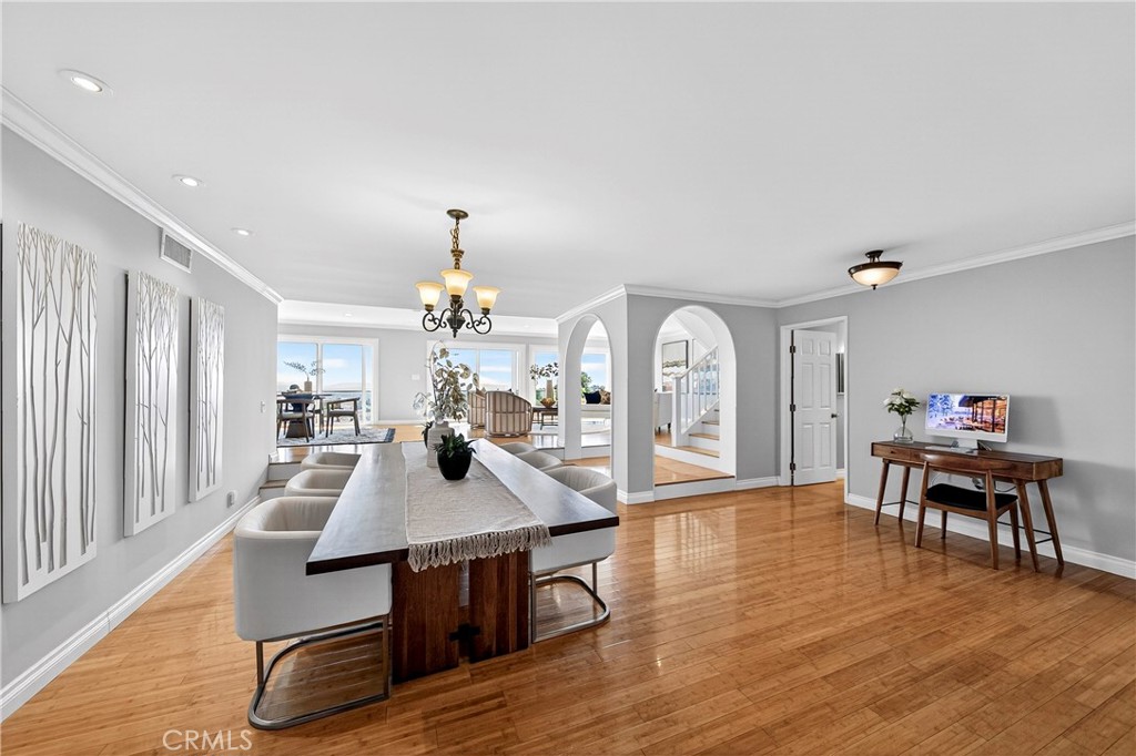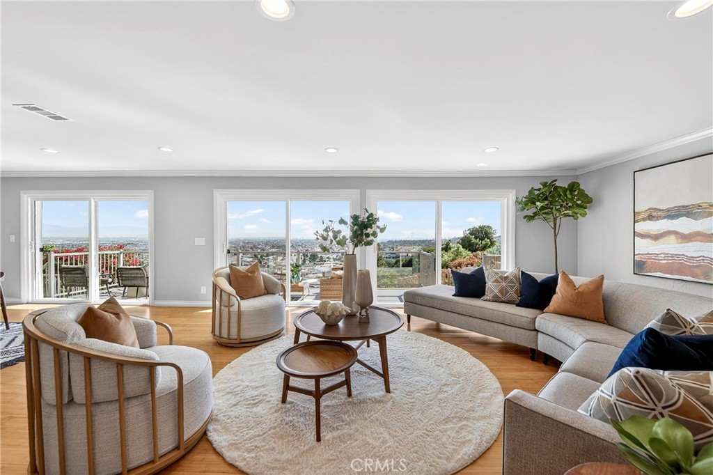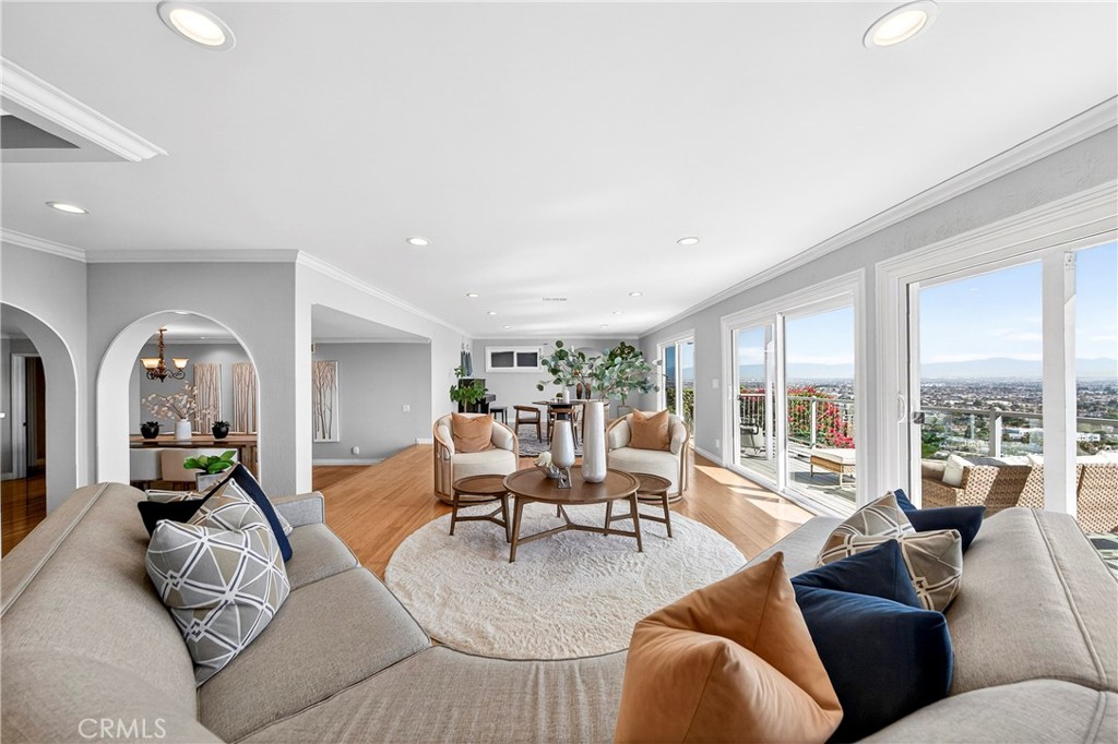 Immaculate home showcasing sweeping views of Victoria Knolls, scenic trails, city lights, and—on clear days—even a glimpse of Redondo Beach. Recently refreshed with a sophisticated, on-trend color palette, the residence welcomes you with a striking visual outlook upon entry. The layout is thoughtfully designed—offering both defined spaces and an open, airy flow—enhanced by subtle architectural arches that add timeless character. The kitchen features freshly painted cabinetry and sits apart while maintaining easy access to the main living areas. Three well-positioned bedrooms provide privacy, set away from the living and dining spaces for comfort and functionality. The spacious living room is lined with windows along the view side, maximizing natural light and capturing the surrounding scenery. Just off the living area, a large balcony provides direct access and serves as an ideal extension of the interior—perfect for enjoying morning sunshine and evening coastal breezes. From the balcony, step down into the backyard, which is enclosed with a newly installed wood fence, offering both privacy and a clean, updated outdoor space. Upstairs, the master bedroom captures tranquil natural surroundings, complemented by a generous family room also surrounded by windows, creating a bright and open atmosphere with continued views. The recently waterproofed deck offers a secluded retreat—ideal for quiet reflection or relaxation. A versatile and beautifully appointed home where exceptional views and thoughtful design come together seamlessly.