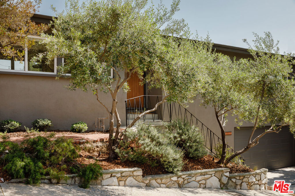 Situated in the hills of Eagle Rock, this beautifully reimagined Mid-Century residence is a true retreat, offering incredible privacy, light-filled spaces, and tranquil treetop views. Elevated above the street and perfectly framed by two mature olive trees, this soulful home offers a sense of calm while being located just moments away from the countless incredible shops and restaurants that Eagle Rock and nearby Highland Park have to offer. Upon entering the home, you are greeted by an abundance of natural light and impeccably designed living spaces that look out to lushly landscaped gardens and verdant views. The open and airy living room features large windows, a stone fireplace, and beautiful custom shelving. Thoughtfully designed for a seamless indoor-outdoor flow, the living room and adjacent dining room’s sliding glass doors open to the home’s multiple magical outdoor spaces, providing endless possibilities for relaxation and entertaining. The beautifully designed grounds are a true extension of the home, featuring a grassy yard, a sprawling L-shaped deck, a lovely lower patio, original breeze block walls, and gardens with an array of native plants, including sycamore and mulberry trees, and tabebuia. Enjoy morning coffee, alfresco dinner parties, and shaded brunches with family and friends while looking out to hillside vistas. The bright kitchen is a chef’s dream, featuring floating wood shelves, polished concrete floors, Cle tile floor accents, Thermador and Samsung appliances, and a sliding window that conveniently opens to the outdoor dining area. The primary bedroom suite is a sanctuary, providing calming views, a spa-like updated en-suite bathroom, and ample closet space. Two well-appointed guest bedrooms share a whimsical bathroom that has been lovingly updated while preserving its original vintage charm – a nod to the home’s Mid-Century roots. The bathroom features hexagon Terracotta floor tiles from Mexico, and the original sink and tub, inspired by Eleanor Roosevelt’s favorite hue of pink. Downstairs, you’ll find a stylish wood-paneled den/office that provides the perfect work from home space or creative escape. This inspiring space features sliding glass doors that lead to a quiet patio, and access to a perfectly designed half bathroom with vibrant blue Cle tile. Additional highlights of the home include a large two-car garage with direct access, a new roof, paid off solar panels, and an EV charger. In addition, this property includes a gently sloping hillside that offers the possibility for expansion, and is located within the coveted Delevan Drive Elementary School district. This incredibly special property captures the true essence of California living, in one of Northeast LA’s most desired neighborhoods.