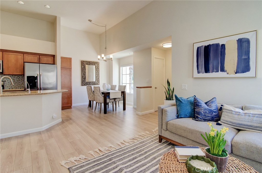 Tucked away in the sought after Briosa community, this stylish and modern upper level 2 bedroom, 1 bathroom condo offers the perfect blend of comfort, function, and charm. From the moment you step inside, the vaulted ceilings and open concept layout create a bright, airy feel that instantly feels like home. The kitchen has been thoughtfully upgraded with granite countertops, a modern tile backsplash, stainless steel appliances, and recessed lighting, perfect for everyday living or entertaining guests. The living area features warm wood laminate flooring and a cozy fireplace accented by a white stacked stone surround, adding a beautiful focal point to the space. Step outside to a private balcony located off both the living room and secondary bedroom, ideal for enjoying California sunsets. The balcony also includes a private storage closet for added convenience. The primary bedroom offers a soft accent wall with ambient lighting, a mirrored walk in closet, and a cozy nook that works beautifully as a reading corner or a spot for a laptop and morning coffee. Briosa is a well maintained community surrounded by lush landscaping and features a pool, spa, park, and walking trails. With nearby access to shopping, dining, and just a short drive to Laguna Beach, Dana Point Harbor, and some of Southern California’s best coastline, this home offers comfort and convenience in a prime location.