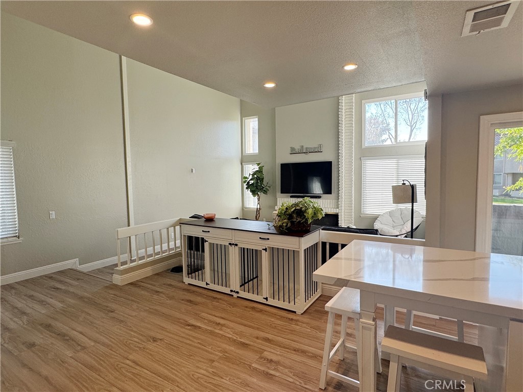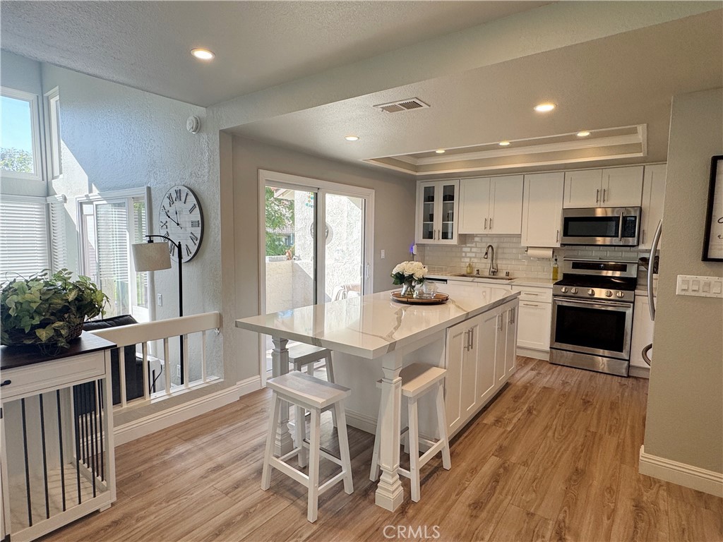 Welcome to 26615 Guadiana—where modern comfort meets timeless tranquility in the heart of Mission Viejo’s beloved La Mancha community. Nestled among mature trees and just steps from the Mission Viejo Country Club, this stunning property offers a rare blend of stylish updates, functional living space, and inviting outdoor retreats. Step through the front door and immediately feel the airiness of soaring vaulted ceilings and an abundance of natural light pouring in through tall picture windows. The open-concept living area is centered around a beautifully painted white brick fireplace, creating a warm focal point for relaxing evenings or casual entertaining. Wide-plank luxury vinyl flooring flows seamlessly into the chef-inspired kitchen, where white shaker cabinetry, gleaming quartz countertops, stainless steel appliances, and a large center island with seating all come together in perfect harmony. Whether you’re enjoying a quiet morning coffee or hosting a dinner with friends, this space adapts effortlessly. Just off the kitchen, sliding doors lead to a private patio with beautiful views—an ideal place to savor California’s golden sunsets or fire up the grill. Upstairs, the primary suite offers a true retreat, featuring vaulted ceilings, plush carpeting, and direct access to a peaceful balcony overlooking the neighborhood’s lush greenbelts. The spa-like ensuite bath impresses with dual vessel sinks, custom cabinetry, and elegant lighting—creating a refined, calming ambiance. Located in the scenic and centrally located La Mancha community, this home places you near award-winning schools, walking trails, local dining, and shopping destinations. You’re also just minutes from freeway access and the serene shores of Lake Mission Viejo. The surrounding neighborhood is rich with charm—tree-lined pathways, open lawns, and a sense of peaceful privacy that’s hard to find. Don’t miss your chance to live in one of Mission Viejo’s most desirable enclaves