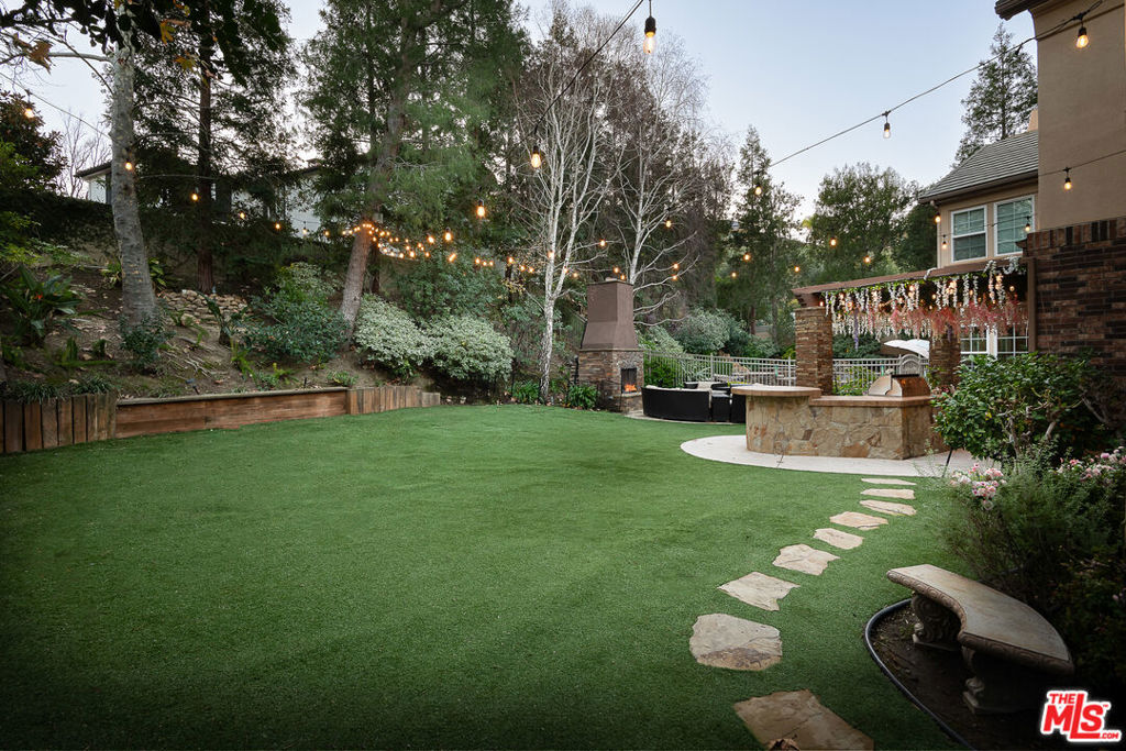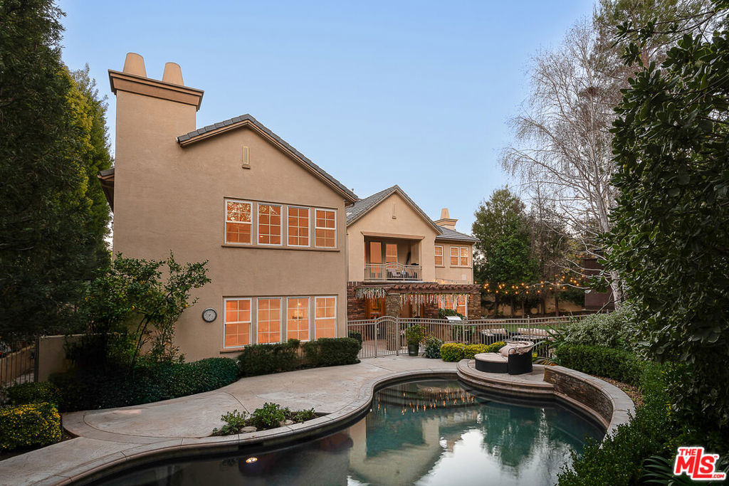 Tucked behind the prestigious guard-gated enclave of Mont Calabasas, this exceptional corner-lot estate offers an extraordinary blend of elegance, comfort, and rare privacy. Set apart with expansive frontage and beautifully mature landscaping, the residence exudes a classic traditional charm that is both warm and inviting from the moment you arrive. Thoughtfully designed for both sophisticated entertaining and everyday living, the home showcases a gracious floor plan filled with natural light and impeccable craftsmanship. At its heart is a stunning chef’s kitchen, anchored by a generous center island and outfitted with premium Viking stainless-steel appliances. Seamlessly open to the inviting family room, this space features a richly detailed coffered ceiling and a welcoming fireplace creating the perfect setting for gatherings of any size. An impressive bonus/game room with its own fireplace and wet bar provides a versatile retreat for recreation and relaxation, while a dedicated home gym offers an ideal space for wellness and fitness. Six beautifully appointed bedrooms include a luxurious primary suite complete with a private balcony, intimate sitting retreat, spa-inspired all-stone bath, and dual custom walk-in closets, an indulgent sanctuary to begin and end each day. Refined interior finishes elevate the home throughout, including gleaming hardwood floors, elegant crown moldings, custom window treatments, beadboard ceilings, and dual staircases that enhance both form and function. The resort-style backyard is a private oasis designed for year-round enjoyment. A sparkling pool and spa with tranquil waterfall serve as the centerpiece, complemented by a covered patio with built-in barbecue center, a charming freestanding stacked-stone fireplace, and a spacious play area. Surrounded by lush, mature trees and meticulously curated landscaping, the grounds provide an unparalleled sense of seclusion and serenity rarely found in today’s market. This is more than a home, it is a beautifully crafted lifestyle opportunity in one of Calabasas’ most sought-after communities.