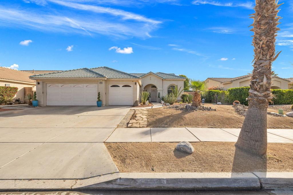 Former La Pasada model home in Cathedral City, set on a quiet, well-kept street with a mountain backdrop and convenient access to Vista Chino, Palm Springs dining and shopping, golf, and the I-10. Strong curb appeal with desert landscaping, a wide driveway, and a covered entry introduces a newer-build feel in an established neighborhood. Rare 3 bedroom, 3 bathroom floor plan plus a true 3 car garage. Inside, the open great room offers vaulted ceilings, recessed lighting, and tile in the main living areas with inviting bedroom carpet, creating an easy flow from living to dining to the kitchen. The kitchen features granite counters, dark cabinetry, stainless appliances, and a center island with seating, plus a sink window overlooking the yard. Sliding doors open to an oversized, private backyard framed by block walls, lush lawn, shade trees, and multiple entertaining zones, including a covered patio with ceiling fan and string lights, a gazebo BBQ area, and a side patio with an outdoor prep sink. The spacious primary suite includes dual sinks, and indoor laundry adds day-to-day ease. A standout opportunity for space, flexibility, and outdoor living in a strong Cathedral City pocket. Great yard for play, pets, and gatherings, with room to personalize your outdoor vision year-round.