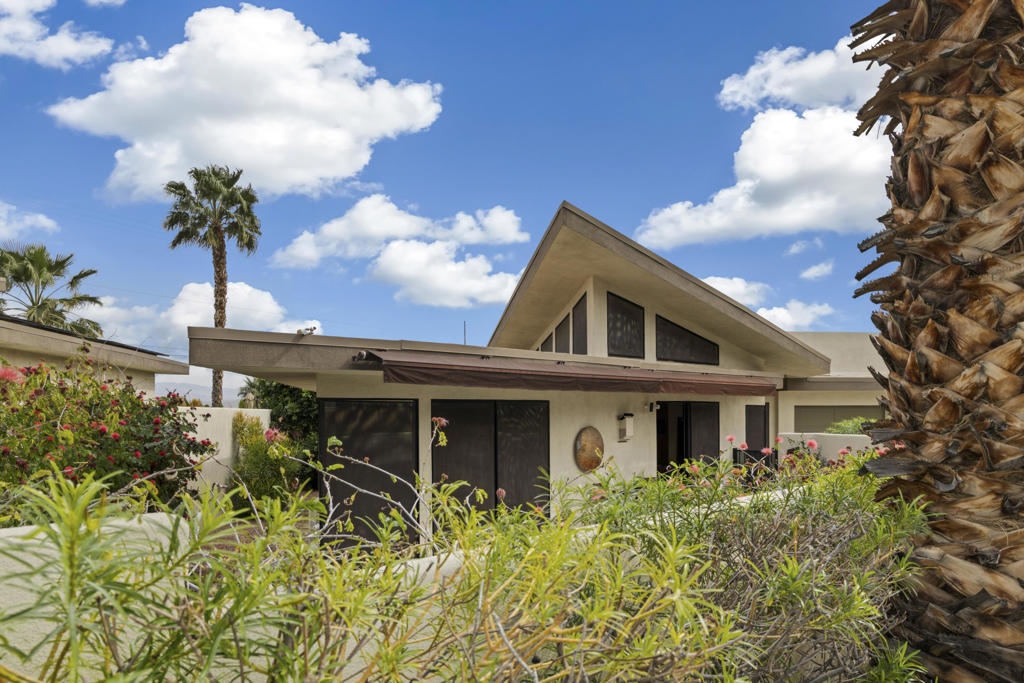 Bright and airy 2-bedroom, 2.5-bath home offering privacy and tranquility in the highly sought-after Chino Canyon neighborhood of Palm Springs. Designed to embrace the best of indoor-outdoor living, this residence features a spacious great room with fireplace, soaring cathedral ceilings, clerestory windows that highlight its mid-century modern character, and sliding glass doors that open to a generous west-facing patio. The outdoor space is ideal for entertaining or relaxing, complete with a pool, beautiful landscaping and panoramic views of the San Jacinto Mountains. Retractable awnings enhance comfort on warm desert days, creating a true private retreat. The kitchen is thoughtfully appointed with granite countertops, stainless steel appliances, breakfast bar seating, and a large pantry for ample storage. The primary suite includes a walk-in closet and direct access to the backyard oasis. Both bedrooms feature en-suite bathrooms with luxury finishes and beautifully tiled showers, while a convenient half bath serves guests. Additional highlights include a laundry room connected to the two-car garage, extensive storage throughout the home and garage, recently repainted exterior, two added mini-split systems for enhanced efficiency, a tankless water heater, and updated window and door screens. The property shares one common wall and operates under a two-member HOA with low dues of $50 per month (or as mutually agreed). A rare opportunity to enjoy comfort, views, and classic Palm Springs style in an exceptional location.