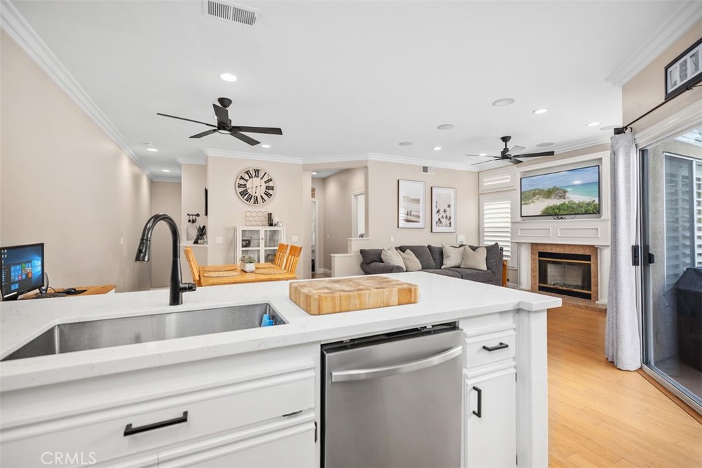 Welcome to this beautifully positioned carriage-style home where all the living spaces are thoughtfully located on one level above the convenient direct-accss one car garage. Perfectly located in the desirable Portola Hills community of Lake Forest. As an end unit, this home enjoys added privacy, and an abundance of natural light, along with the rare advantage of being adjacent to a private grassy greenbelt. This beautifully maintained 2-bedroom, 2-bath residence offers an open, light-filled floor plan and tasteful designer finishes including crown moulding throughout. A welcoming living area centers on a unique “fire & ice” glass fireplace and flows seamlessly to the open kitchen and the private outdoor balcony — ideal for morning coffee, evening BBQs or relaxing and unwinding. The heart of the home is the renovated kitchen, featuring brand-new stainless steel appliances, quartz countertops, a large steel farmhouse sink, modern fixtures and white cabinetry. Crown molding and custom plantation shutters add refined architectural detail, while new ceiling fans, newer carpet and fresh finishes provide comfort and style. Recent high-end HVAC installation ensures efficient climate control year-round! Both bedrooms are generous in size. The master suite has been thoughtfully updated with a full remodel — new vanity, soaking tub, modern tile surround in the shower, new porcelain tile and contemporary lighting. The second bedroom includes a custom shiplap wall and closet organizer for enhanced storage and organization. Residents enjoy HOA amenities such as a private community pool, spa and fitness center, plus plentiful guest parking and low HOA fees. The location is exceptional within Saddleback Valley — close to parks, sports fields, top hiking and biking trails at Whiting Ranch Wilderness Park, shopping, dining, easy transportation routes and a short drive to world-class beaches along the Pacific coastline. Turnkey condition and thoughtful upgrades make this condo an outstanding opportunity to enjoy Southern Orange County living. All of this is complimented by low property taxes and affordable HOA fees, making this an exceptional value. Schedule your showing today!