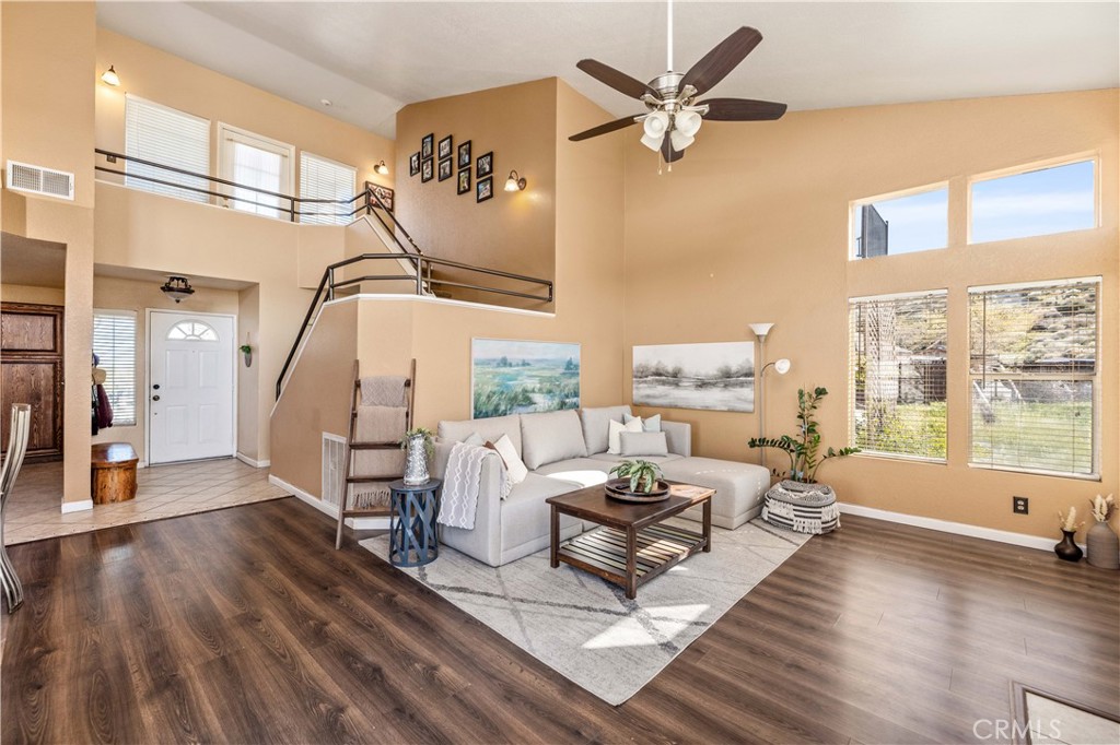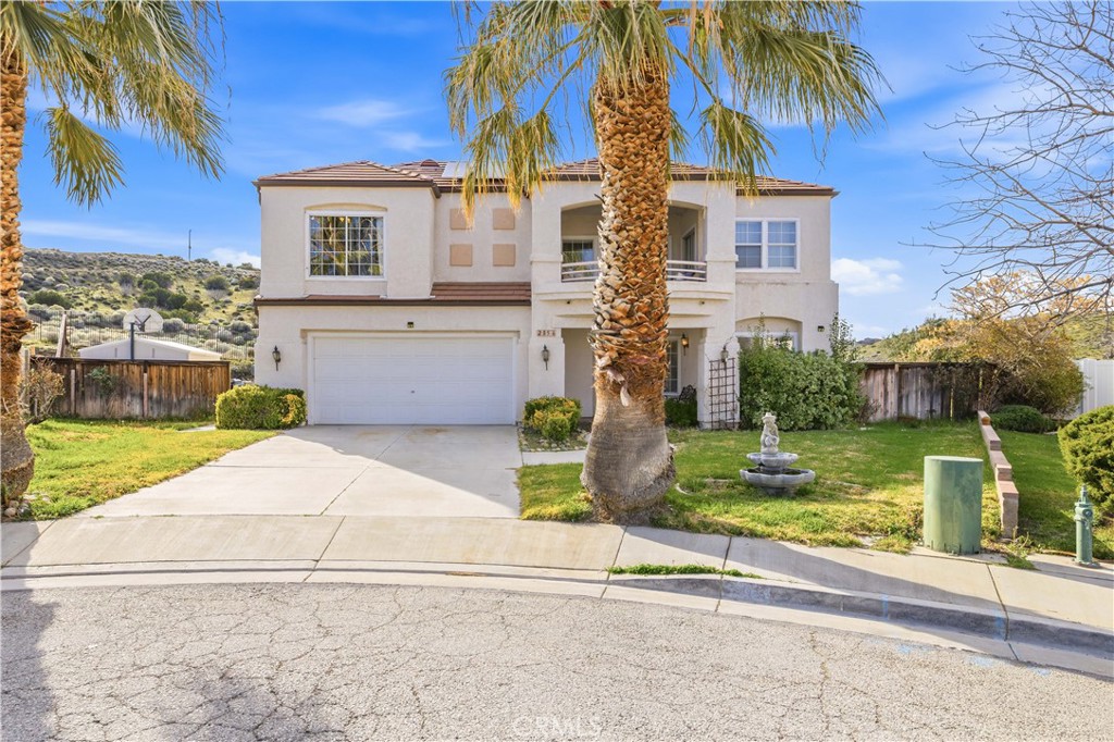 Set on a hillside, this beautiful two-story home sits at the top of a quiet cul-de-sac, offering privacy and scenic views. The Mediterranean-inspired exterior is complemented by a charming front balcony, perfect for enjoying valley vistas—while the interior features clean, contemporary styling. The first level is filled with abundant natural light and high ceilings. The cozy living room features a fireplace and a sliding glass door that opens to the spacious backyard, creating a seamless indoor-outdoor flow. The kitchen boasts stainless steel appliances, granite countertops, and a tiled backsplash and flooring, ideal for both everyday living and entertaining. A convenient powder room completes the first floor. Upstairs, an elegant staircase leads to the second level, which offers three nicely sized bedrooms with mirrored closet doors that enhance brightness and space. The hallway opens to a front-facing balcony with seating and views, creating an inviting shared area. The generously sized primary suite features large closets, dual sinks, a full bath, and direct access to a private rear balcony overlooking the backyard and open space beyond.The expansive backyard includes an oversized patio, a lush lawn with stepping-stone pathways, a storage shed, and impressive open views—perfect for relaxing, entertaining, or future customization. This sunny and cozy home offers comfort, style, and a highly desirable hillside setting.