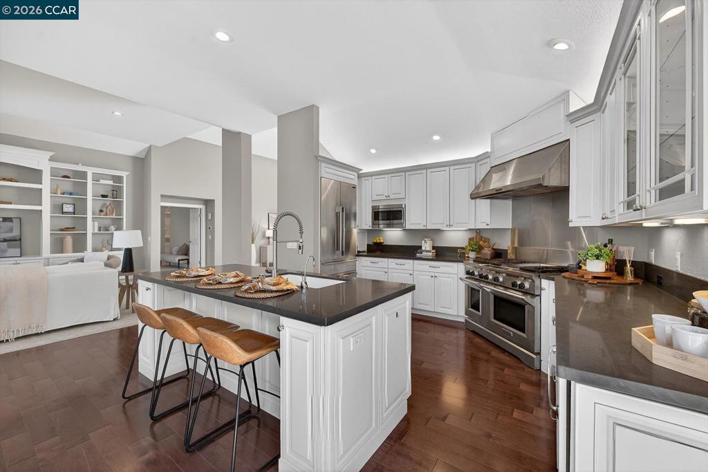 Welcome to an exceptional single-story residence ideally situated on the fairway of the Lakes Golf Course, inside the main gate of the prestigious Blackhawk Country Club. This beautifully appointed 3-bedroom, 2.5-bath home offers an elegant open floor plan designed for both comfortable living and effortless entertaining. The inviting Great Room features soaring vaulted ceilings, a cozy gas fireplace, and a custom built-in wall of shelving and bookcases with integrated storage. A formal dining room provides the perfect setting for memorable gatherings. The gourmet kitchen is truly a dream for any culinary enthusiast, showcasing a commercial-grade gas cooktop with double ovens, premium built-in stainless steel appliances, a French-style stainless refrigerator, granite countertops, and rich hardwood flooring. The spacious primary suite is a private retreat, complete with vaulted ceilings, custom walk-in closet organizers, and sliding glass doors that open to the outdoor patio. The luxurious primary bath features stone flooring, dual vanities, a relaxing soaking tub, and a separate stall shower. Enjoy tranquil golf course views and the security of one of Danville’s most sought-after gated communities.