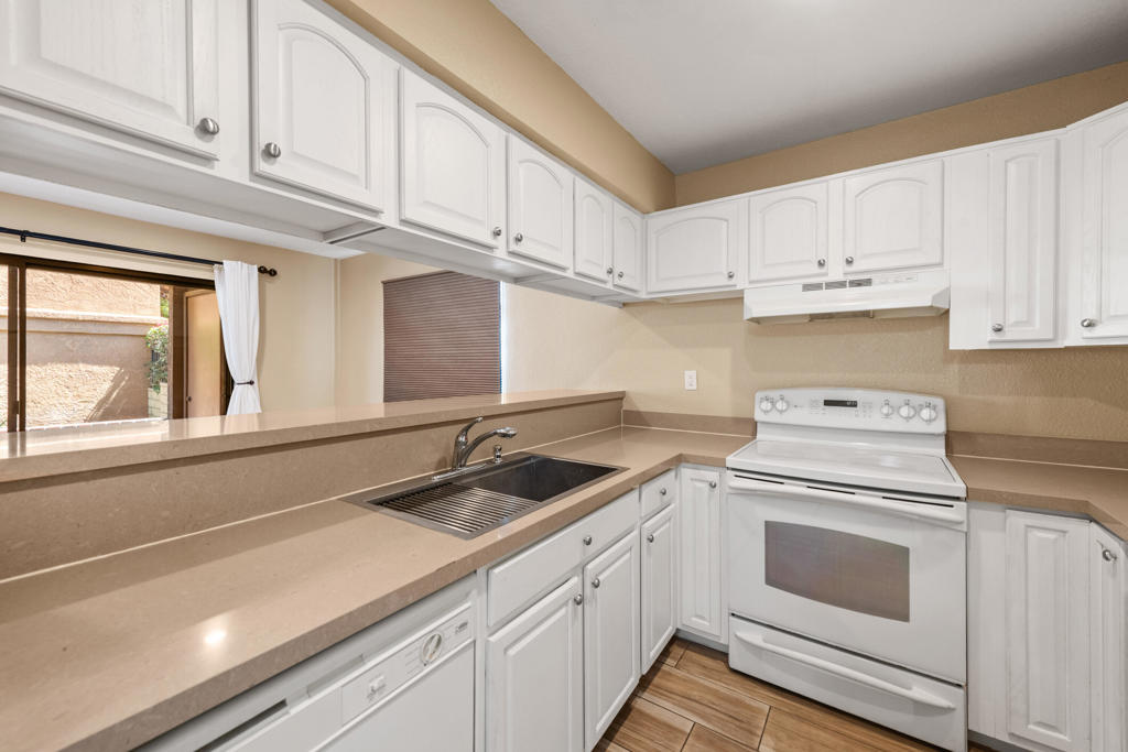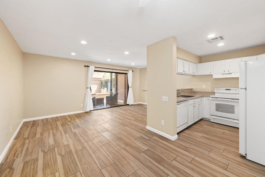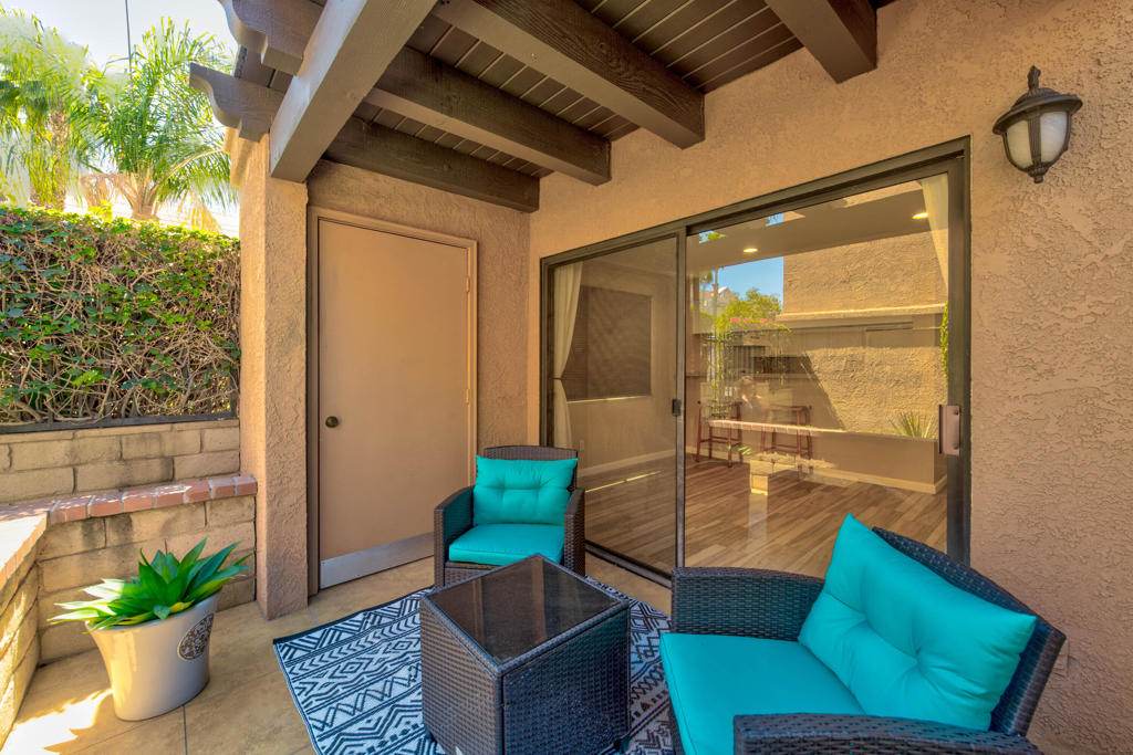 You know what they say: ‘Location, location, location…’ Well, this property hits the mark! Not only is it close to famous downtown Palm Springs and all its shopping, dining and activities, it’s also right next door to Desert Regional Hospital (Great for nurses or physicians, traveling nurses, etc..) AND it’s an unit + it’s downstairs. The complex is gated with secured, assigned parking + loads of additional parking for family, friends, or extra vehicles. Speaking of parking, #200 is beside the community’s back pedestrian gate, providing easy load-in and out of shopping treasures + parking access. No big stairways or long walks carrying groceries. Inside the condo you’ll notice…NO CARPET, whew! Instead, there’s wood-like tile that keeps things cool and easy to clean. There are two bedrooms with ample mirrored closets and a shared tiled & walled back patio with mountain views. The bathrooms have newer updates including a walk-in shower in one of them. There’s a stackable washer and dryer. The living room has a slider out to the front tiled patio that provides afternoon shade and an extra locking storage shed. Because it’s an end unit, it has extra light + a feeling of openness. There are ceiling fans throughout, recessed lights, quartz countertops, breakfast bar, dishwasher & fridge. The beautifully maintained & lush community has a large, centered, welcoming pool & spa + tennis courts & community mailbox. Water & trash are included in HOA. Celebrities & the rich and famous have enjoyed Palm Springs living for years..now it’s YOUR turn. Enjoy resort-style living, right here in Rancho El Mirador, at a super affordable price + you own the land.