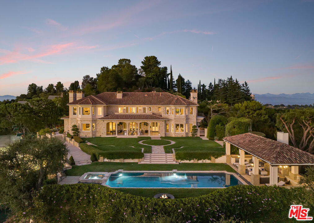 The Antelo View Estate stands as one of Los Angeles’ most distinguished and irreplaceable residences, tucked away at the end of a secluded private road in Bel-Air. With nearly unmatched scale, privacy, and design pedigree, this exceptional compound encompasses two APNs and is secured behind double gates, unveiling a world entirely its own. A sweeping motor court welcomes guests with commanding views stretching from the glittering city skyline to the serene mountains and the Pacific Ocean beyond. Graceful fountains accent the arrival, their gentle flow enhancing the sense of tranquility and grandeur that defines the estate. Completely reimagined through an extensive, design-driven remodel, the estate masterfully fuses timeless sophistication with modern innovation. The 6-bedroom, 9-bath main residence is defined by grand-scale interiors, filled with abundant natural light and breathtaking views from nearly every room. Stately fireplaces throughout the home offer warmth, dramatic presence, and intimate gathering spaces, anchoring living areas with a sense of refined elegance. The lower level is a retreat for both leisure and entertainment, featuring a state-of-the-art theater with bar, a private gym with steam shower, wine storage, and flexible staff or wellness quarters. At the heart of the home lies a spectacular new chef’s kitchen, curated with bespoke white oak cabinetry, hand-selected marble countertops, dual oversized sinks, and an array of Miele and Gaggenau appliances. An exquisite brass wine display, inviting fireplace, walk-in pantry, and breakfast nook with unobstructed views further elevate the space, transforming everyday living into an art form. The second floor reveals four gracious bedrooms, crowned by a primary suite of rare distinction. The suite features dual spa-inspired baths, expansive walk-in dressing rooms, a fireplace for quiet evenings, a private office, and a vast terrace that embraces the horizon. Beyond the main residence, two guest homes extend the estate’s legacy of luxury. The upper two-story guest house presents nearly 3,000 square feet, complete with two bedrooms, three baths, a full kitchen, and a great room anchored by a dramatic fireplace. French doors open to garden terraces accompanied by gentle fountains and rolling lawns, crafting an atmosphere of serenity. The lower guest home, nestled under the tennis court, offers two bedrooms, two baths, a full kitchen, laundry, and wrap-around terraces immersed in tranquil treetop views perfect for long-stay guests or staff. Outdoors, the grounds unfold in true resort style: a dramatic swimming pool with cabana, a tennis court with viewing pavilions, manicured gardens, and a romantic loggia designed for alfresco dining or intimate wine tastings. Fountain features dot the landscape, blending the soothing sound of flowing water with the natural beauty of the gardens. Interwoven pathways and a private golf cart circuit encircle the entire estate, underscoring its rare sense of scale and seclusion. The Antelo View Estate is more than a home it is a private sanctuary of architectural beauty and natural majesty. With its many fireplaces, enchanting fountains, unrivaled vistas, world-class amenities, and a level of craftsmanship seldom seen, this legacy compound represents one of the most important and prestigious offerings to ever arrive on the market in Bel-Air.