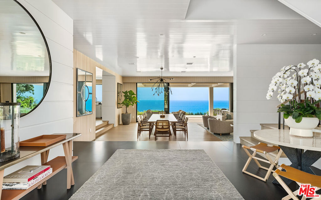 A contemporary coastal estate with panoramic ocean views, 29754 Baden Place offers refined design and true indoor-outdoor living. Set above the Pacific, the home features clean modern lines, hand-troweled plaster walls, expansive terraces, and every luxury amenity. The main level opens to a bright foyer and glass-lined living spaces overlooking the ocean. The dining room and fireside lounge are ideal for entertaining, while the library and bar lounge offer a private retreat. The chef’s kitchen includes Miele and Wolf appliances, marble counters, a large island, and a breakfast nook with ocean views. Upstairs, the primary suite features vaulted ceilings, a private oceanfront balcony, a sleek fireplace, and a spa-like bath with a soaking tub framed by an ocean-view window, dual stone vanities, a glass shower, generous closets, and a private sauna. Resort-style outdoor living includes multiple terraces, a pergola-covered lounge with fireplace, manicured gardens, a pool and spa, and a dedicated pickleball court- all oriented toward sweeping views of the Malibu coastline. From here, it’s common to watch dolphins and whales passing along the shore. Modern systems include a Crestron smart home platform, full-property security and cameras, and thoughtful materials throughout, including natural wood flooring, custom plaster finishes, and designer fixtures. A rare blend of privacy, architecture, and oceanfront perspective, 29754 Baden Place offers a serene seaside retreat designed for elevated Malibu living.