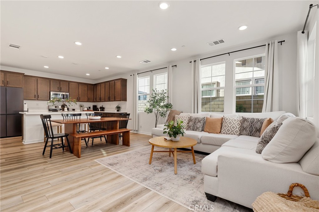 Welcome to 2983 E Halton Paseo, nestled in the desirable Cambridge Court neighborhood of Ontario. This fully upgraded home showcases luxury vinyl plank flooring throughout, quartz counters throughout, recessed lighting, and an open-concept design. The modern kitchen features quartz countertops, stainless steel appliances, a walk-in pantry, and a spacious center island that flows seamlessly into the living room. Sliding doors open to a wrap-around backyard with low-maintenance artificial turf, perfect for relaxing or entertaining. The main floor offers a bedroom and full bathroom, along with a two-car attached garage. Upstairs, enjoy a large loft and a primary suite with a walk-in closet and spa-inspired bathroom, complete with dual sinks, quartz vanity, and a supershower. Two additional bedrooms share a full hall bathroom. Energy-efficient leased solar panels add value and savings. Community amenities include a nearby park and playground.