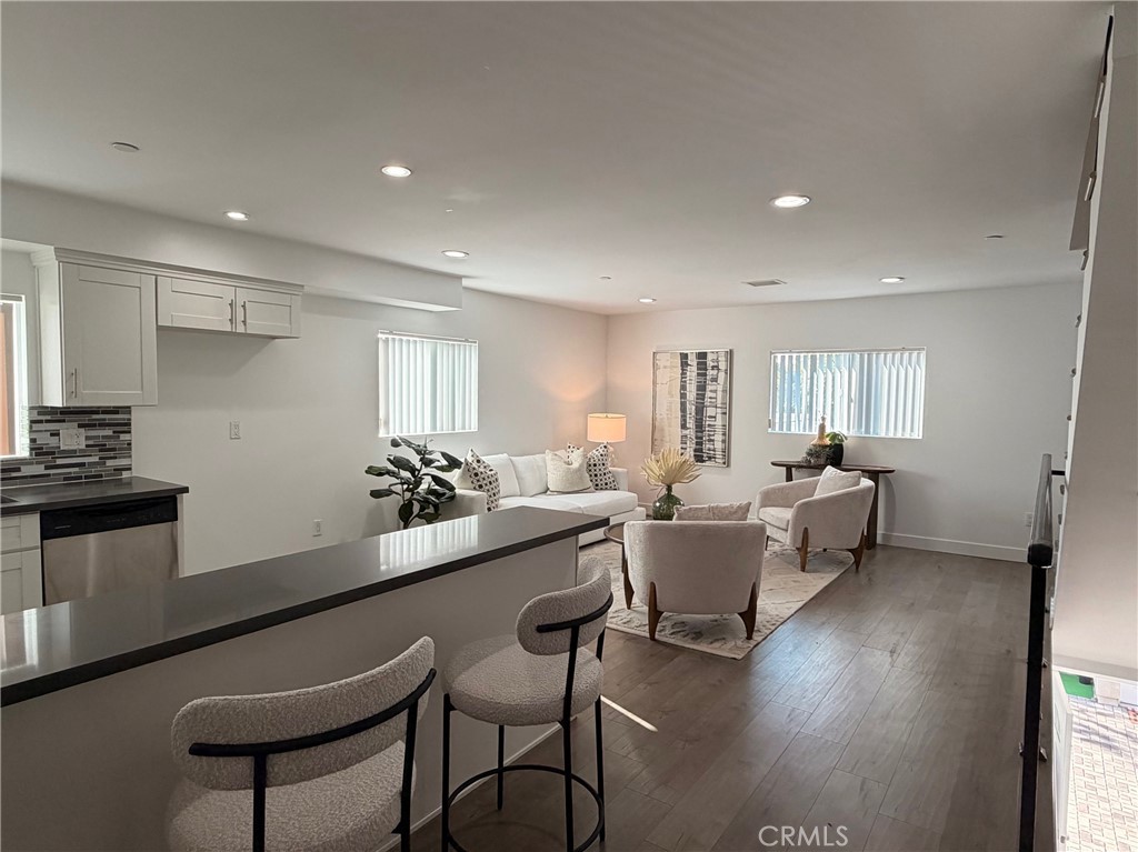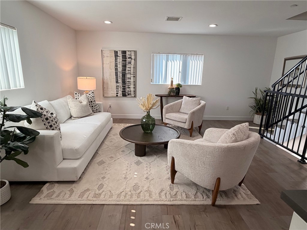 Welcome to this stunning and thoughtfully designed 2-story town home offering 3 spacious bedrooms and 3 full bathrooms, filled with natural light and modern finishes throughout. The open concept main level is ideal for both everyday living and entertaining, featuring laminated flooring, recessed lighting, and a seamless flow between the living, dining, and kitchen areas. The kitchen is a standout, showcasing crisp white shaker cabinetry, sleek quartz countertops, a stylish mosaic tile backsplash, stainless steel appliances, and an island with bar seating, perfect for casual dining or hosting guests. Ample cabinet space and modern finishes create a clean, timeless aesthetic. Bathrooms are equally well appointed with contemporary vanities, quality fixtures, and clean, modern tile work, offering both style and comfort. The thoughtful layout provides privacy and functionality, with bedrooms well separated across the two levels. Additional highlights include high ceilings, abundant natural light, and a beautiful staircase with iron railing that adds architectural interest. This home blends comfort, style, and practicality, ideal for today’s lifestyle. A true turnkey opportunity in a desirable town home setting. Do not miss this one.
