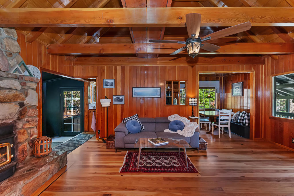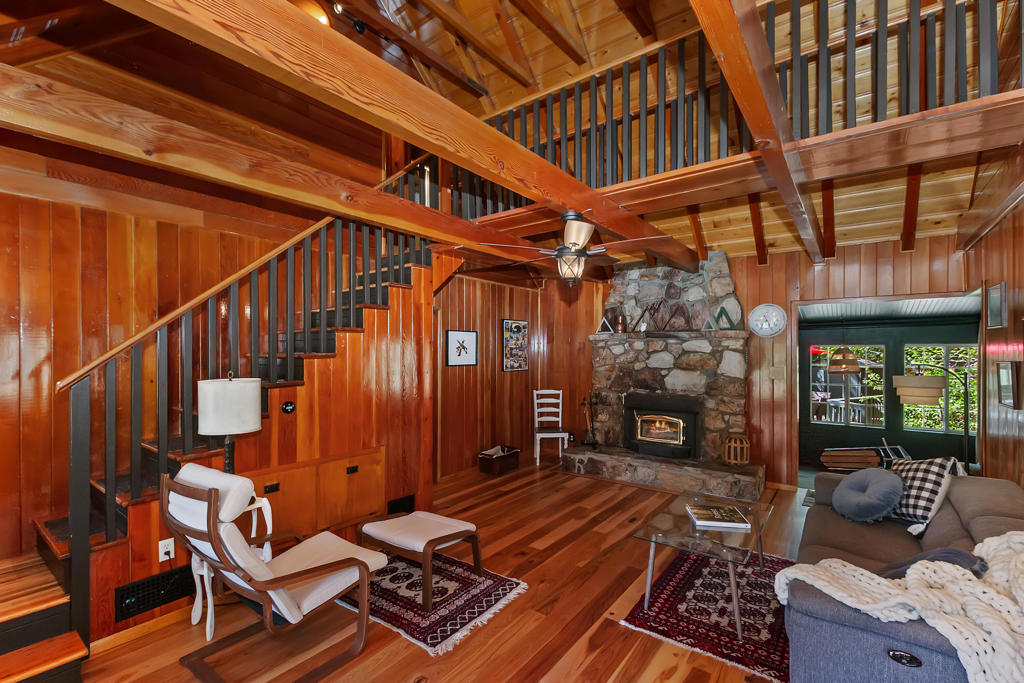 Nestled On A Corner Lot, This 1950s Gem Boasts A Stunning Floor-To-Ceiling Native Rock Fireplace And A Warm Knotty Pine Interior With Vaulted Ceilings. The Home Features Beautiful Hardwood Flooring, Including Hickory With Elegant Walnut Trim. The Main Level Offers A Comfortable Living Room, A Kitchen, A Sunny Sunroom, A Practical Mudroom And Laundry Area, A Bedroom, And A Full Bathroom. Upstairs, You’ll Find Two Additional Bedrooms And A Bathroom With A Shower. The Third Bedroom, Currently Utilized As An Office, Is Non-Conforming, Offering Flexible Space. From The Sunroom, You Can Step Into A Relaxing Fenced Backyard. This Outdoor Haven Features A Native Stone Terraced Garden, A Tranquil Waterfall With A Pond, Established Trees, And Lilacs That Enhance The Sense Of Seclusion. The Spacious Hardscape Area Provides Ample Room For A Hot Tub, And The Patio Is Great For Hosting Barbecues. This Property Also Includes A Convenient Two-Car Garage With Extra Off-Street Parking. Nature Enthusiasts Will Appreciate The Lookout Hiking Trail Just A Block Away, Connecting To The Extensive Maple Hill Trails. You’ll Also Find Nearby Shops, Stores, And Restaurants Within Easy Reach. The Property Is Approximately 5 Miles From Big Bear Lake Village And Bear Mountain Ski Resort/Golf Course, And About 2.5 Miles From The Shores Of Big Bear Lake. Adding To Its Appeal, The Cabin Has A Newer Roof, An Upgraded Heating System, And Updated Electrical And Plumbing. As A Bonus, A Cinderblock Storage Building Could Be Used For Root Or Wine Cellar And Inventory Of Furnishings Included..