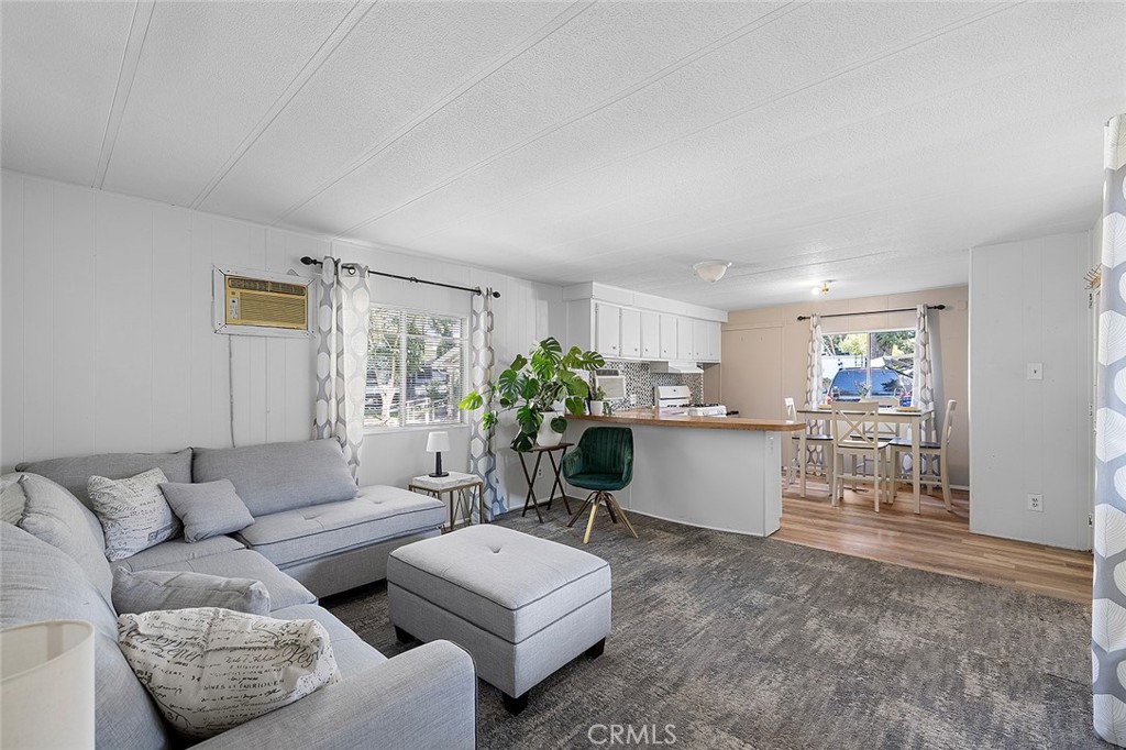 Located in a well maintained 55+ community, this one bedroom manufactured home offers great potential. This open floor plan features a light and bright interior with large windows that bring in plenty of natural light. Two wall A/C units provides cooling throughout, in unit laundry hookups for added convenience. Parking is located directly in front of the home for easy access. Don’t miss your chance to own in a community close to shopping, parks and freeways.