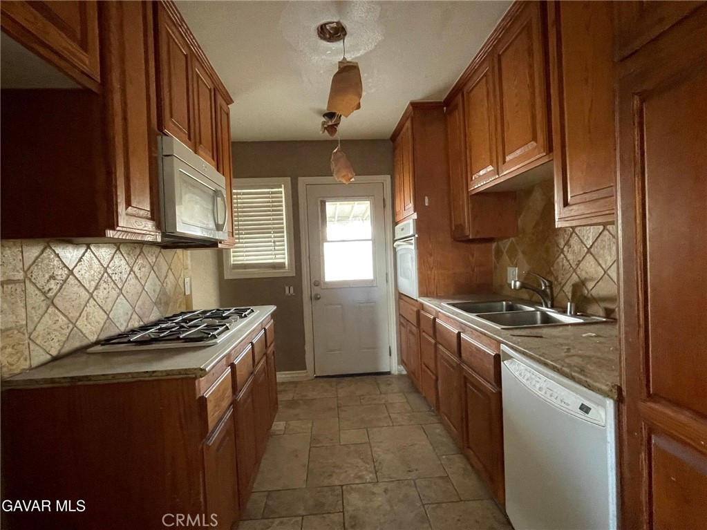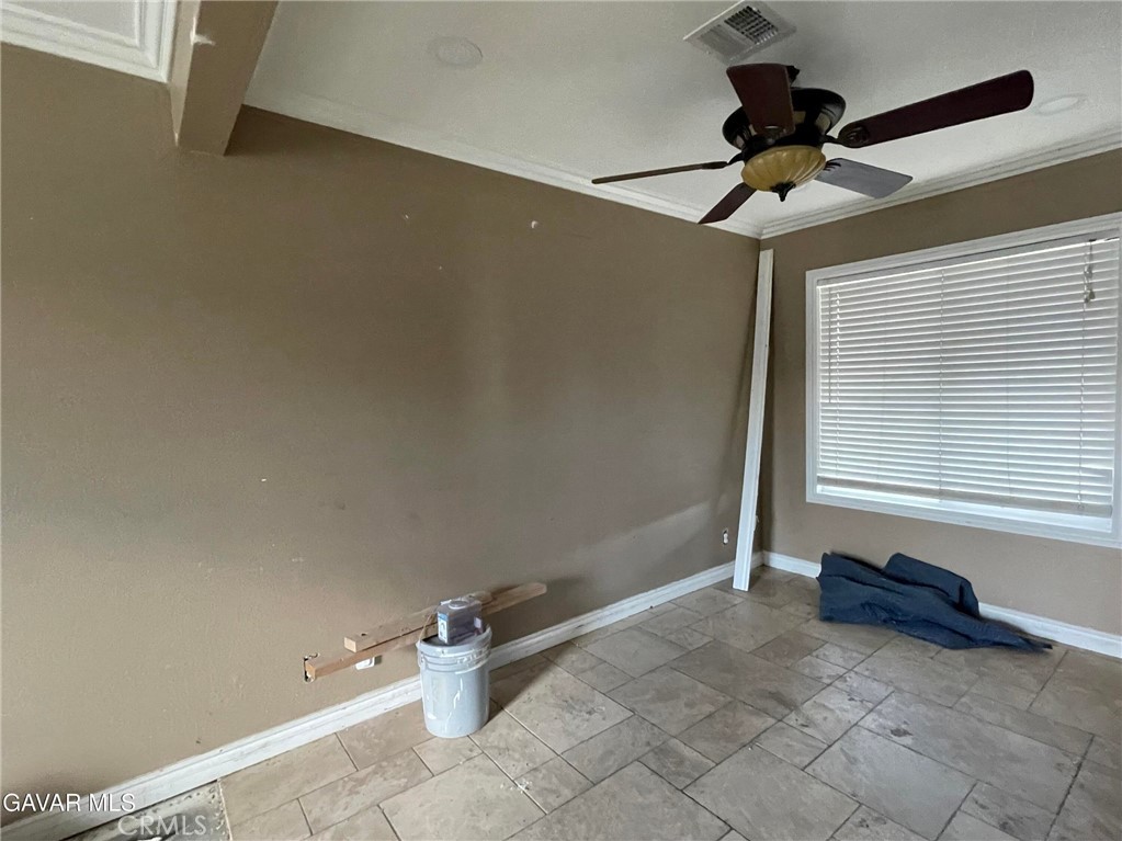 Three Bedroom two bath home with some nice Upgrades including some Travertine Flooring, Crown Molding, White Window Casings, Wide Baseboards, Ceiling Fans but but not all projects have been completed. There is a cozy Brick Fireplace in the Living Room. The Kitchen has Stone Tile Backsplash. The Shower in the Master was redone with Stone Tile surround. The AC looks newer. And there is a Covered Patio in Back. And in the Front is a Gated Wrought Iron Entry.