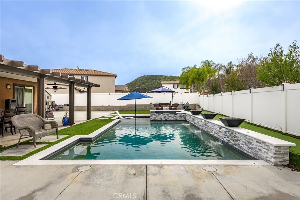 Welcome to your private sanctuary in the prestigious San Marino community of Menifee. This impeccably designed 3-bedroom, 2-bathroom single story home offers the perfect blend of sophisticated indoor comfort and a backyard that rivals a five-star resort. Step inside to find an airy, open floor plan adorned with stunning wood-look tile flooring and premium California shutters throughout. The heart of the home flows seamlessly, but the real showstopper lies just beyond the sliding doors. The backyard is an entertainer’s dream, featuring a sparkling Pebble Tec pool and spa complete with a Baja shelf, three dramatic waterfalls, and three flickering fire bowls and a fully removable pool fence. Practice your short game on your private 4-hole putting green, or unwind by the firepit. For summer nights enjoy outdoors under the expansive Alumawood covered patio. Enjoy the ultimate peace of mind with fully owned Tesla Solar panels and two Tesla Power wall and EV chargers, ensuring top-tier energy efficiency. Extended driveway for potential trailer parking. Do not miss the opportunity, schedule your showing today!