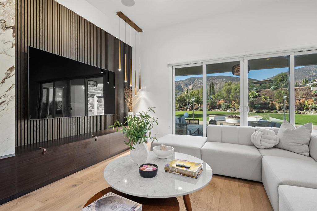 Bella Lago stunning single story modern home situated on almost a one acre of land with its own private golf course w/five putting greens & two sand traps, perfectly blending luxury with nature. As you step inside, an expansive open-concept living area with natural light, high ceilings, a minimalist designed art stone wall w/fireplace and sophisticated lighting, 70 inch TV. Adjacent to this is a state of the-art Kitchen equipped with top of the line Kitchen Aid appliances, an oversized island with bar seating, spacious nook, custom cabinetry, morning coffee bar and a marvelous custom walk-in pantry. The Wet Bar designed with glass tiles, mirrored panels, quartz, wine refrigerator and ice drawer is simply divine! The Dining Room offers an outstanding Glass Chandelier. The Master Suite is a retreat in itself, featuring a stunning custom wall w/marble slab and cozy fireplace, lovely vanity area, floating toilet, spacious custom walk-in closet and luxurious bathroom with a soaking tub and a walking-in shower, spectacular vanity area! Second Master Suite w/living area, full bath and bar area with refrigerator.The Powder Room is stunning lovely custom wall porcelain, floating toilet, quartz vanity and custom lighting. Meticulous landscaping makes this oasis for a lifestyle designed for relaxation, entertainment, and enjoyment offering a firepit and outdoor kitchen! Utilize the natural herbs for the chef right in your backyard. All home with hardwood floors, hand trowel texture walls, Solar Panels, A.C. unit!