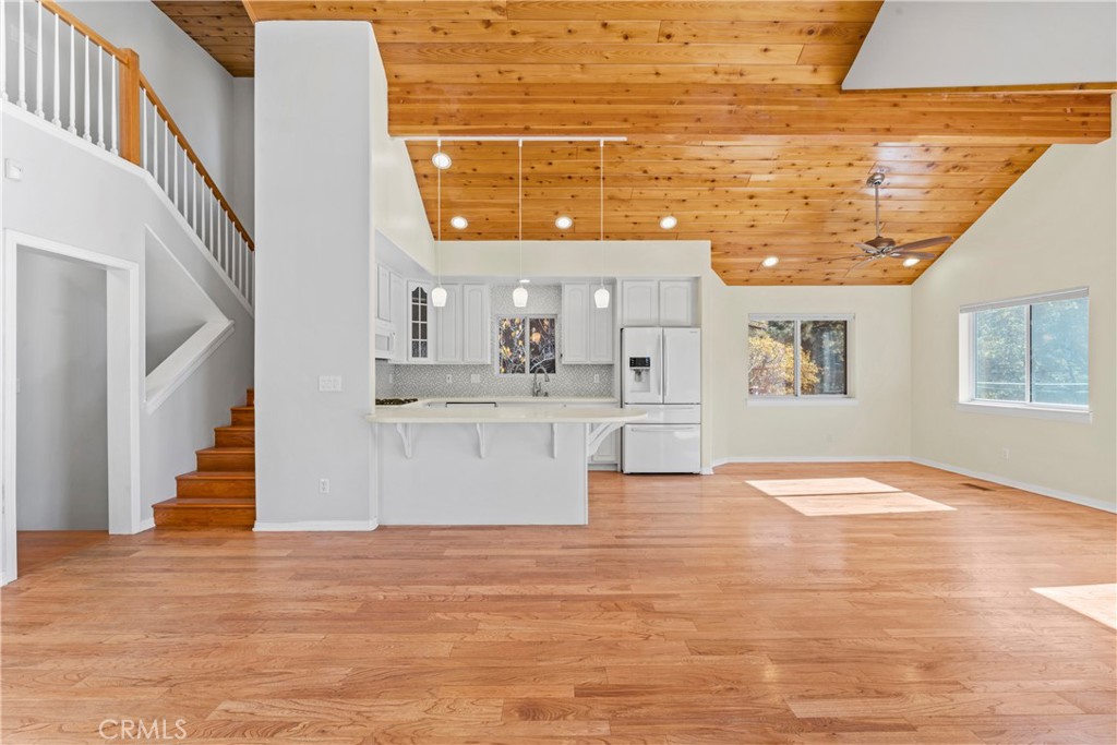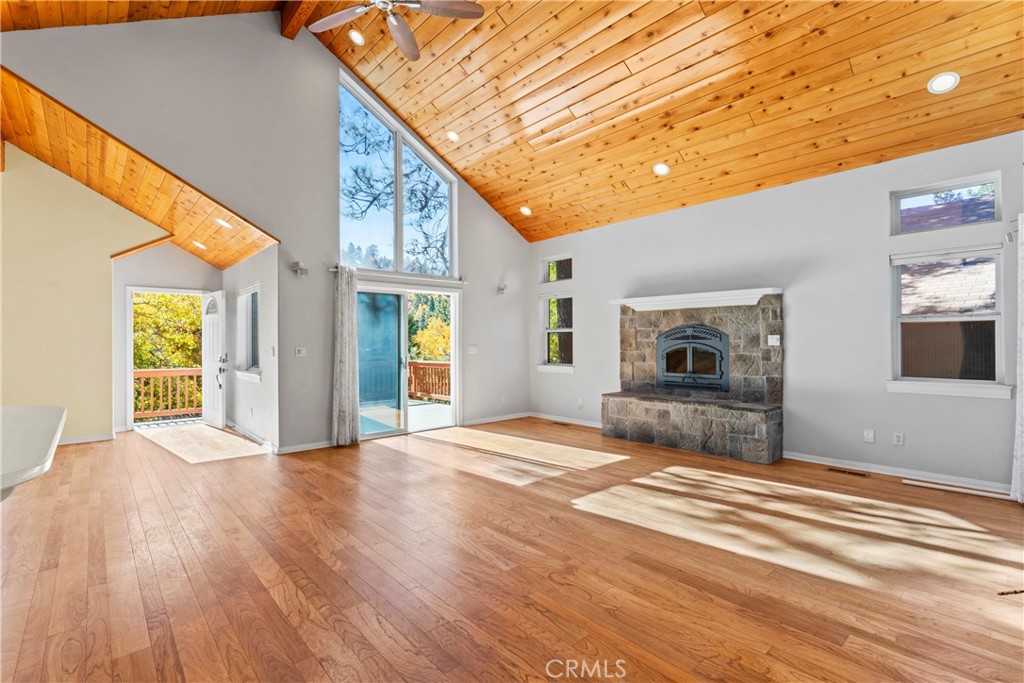Off the Charts Pride of Ownership on this Completely Remodeled Dramatic 3-Story Residence boasting 2,340 sqft of Gleaming Hardwood Flooring with towering Mirror Sheen Knotty Pine Ceilings, Open Kitchen with Convection Oven and Barstool Counter opens to Dining and Living Room with Fireplace all Drenched in Natural Light, Dual Pane Tinted Windows throughout, Surround Sound on First and Second Floors, Primary Ensuite Bedroom, 2 Guest Bedrooms, Expansive Closet Spaces and Custom Shelving, Rare Over-sized Laundry Room with Side by Side Washer and Dryer, Entertaining Decking Areas with inviting Jacuzzi, Epoxy Flooring Immaculate Utility Room inclusive of Water Purification System, Natural Gas Forced Air Heating Unit and 2-On Demand Water Heaters one for the Residence and the other for the Heated Cement Driveway with 2-Zones, Family Room with Fireplace, Bonus Fenced Rear Yard and Storage Area Workshop complete with Stainless Dog Washing Sink and Toilet and of course the Garden Area is complete with Irrigation Sprinklers. Absolute Impeccable Turnkey Residence and one of the finest homes offered in this Treasured Community of Green Valley Lake!