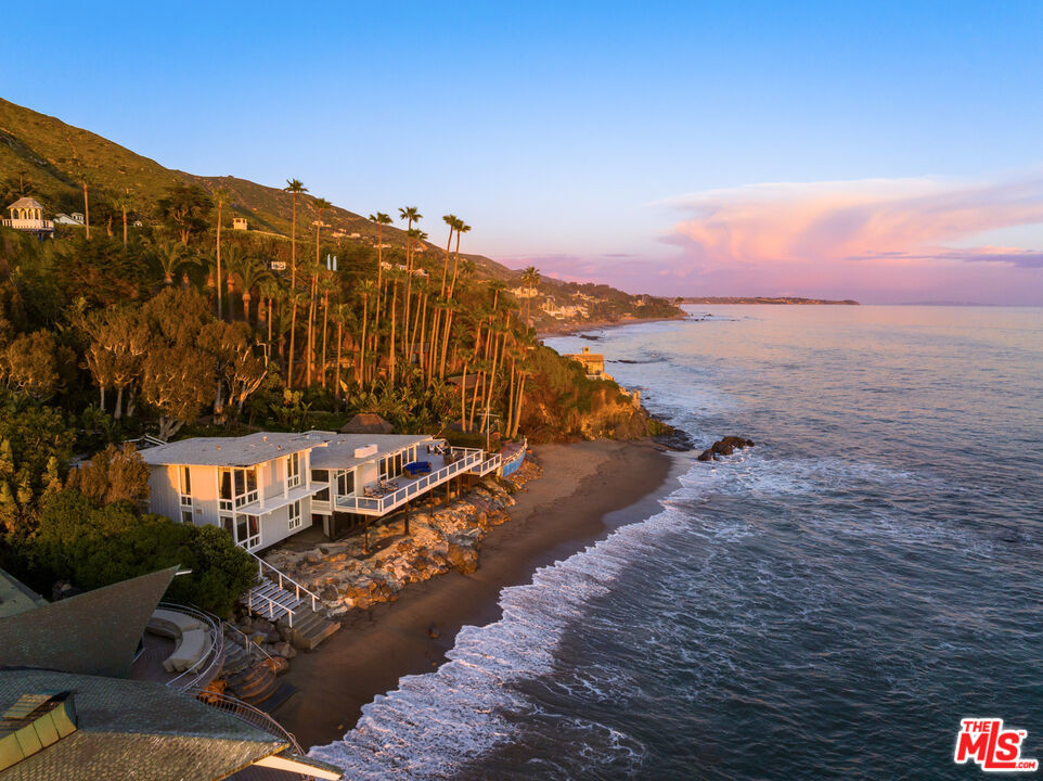A private tropical paradise, this Western Malibu mid-century beachfront home is offered for lease for the first time. Magnificent palms, enormous window walls, expansive decks, and sensational views create an away-from-it-all atmosphere. The well-maintained interior is detailed with wood, including wood ceilings, Saltillo tile, and built-in shelves and cabinets characteristic of mid-century design.Known as Watkin’s Cove, the terraced cul-de-sac property steps down from an upper-level two-car garage. A beautiful walkway meanders through lush gardens and terraced lawn areas, with a creek, a small pond, and a fountain.The ocean is on view from the moment you step into the foyer. Ahead is the spacious living room, with wraparound windows, fireplace, and a brick hearth that extends the length of one wall as a window seat. Adjoining the living room is a great room that comprises a top-quality kitchen, dining area, and bar, plus a pantry. With floor-to-ceiling windows on two sides, this large room opens onto a huge, wraparound, multi-level deck complete with a tiki hut bar, barbecue and dining area, and ample room for lounging and entertaining overlooking the beach, coastline, ocean, and island views. There is also a powder room on this level.The lower level has three bedrooms plus a recreation/media room, while the upper level has three more bedrooms, including the primary suite, which has gorgeous panoramic ocean views.The home offers wonderful settings for indoor-outdoor entertaining, including a peaceful front yard with ocean views, decks on two levels, lawns surrounded by flower gardens, and a wide stairway leading to the quiet, sandy beach below. A rare Malibu treasure.