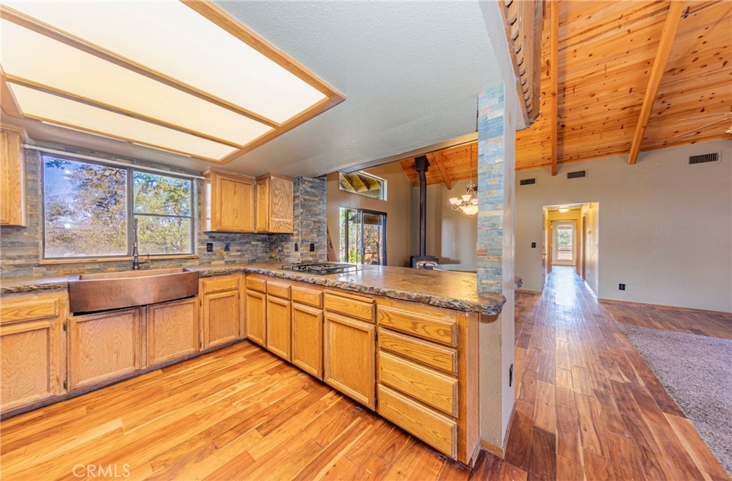 Hobby Horse Ranch on 2.5 acres, fenced and crossed fenced. Coarsegold, partial A frame, Advanced Home, western theme. Beautiful custom kitchen with copper sink, Shiplap master bedroom. Custom concrete kitchen counters. There is a loft would be a great kids play area. Newer wood stove Separate hay barn, separate 3 stall barn with pass thru doors, nice size arena, horse wash station, tack room. 2 large open stalls. Mature fruit trees, chicken coop, cat house, and some lovely landscaping all on a corner lot. Plenty of room for RV Seller still in process of moving items out of barn and some minor repairs