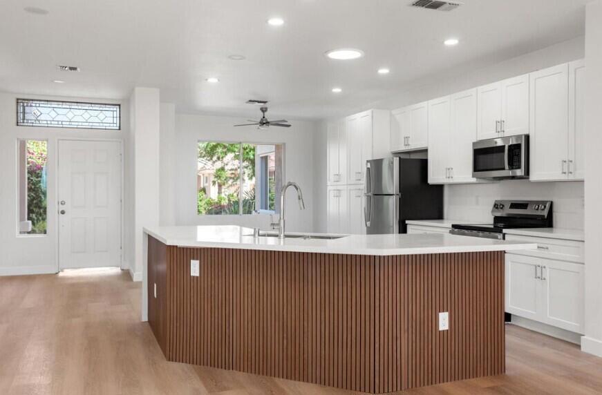 **Exceptional Sun City Expanded Montego Floor Plan on the Golf Course**Discover your dream home in Sun City Palm Desert: Originally a Model Home 3 bedrooms in the main house plus a 1-bedroom, 1-bathroom casita. Enjoy breathtaking panoramic mountain and golf course views from your own private spool. Upon entering, you’ll be welcomed by a luxurious open-concept living area. The kitchen is adorned with sleek quartz countertops, a stunning waterfall island bar and updated lighting along with a skylight that bathes the space in natural light. The seamless flow into the living and dining areas is complemented by expansive sliding glass doors and windows along the back wall, providing unobstructed views of the picturesque golf course and allowing for the perfect indoor – outdoor living.The right wing of this magnificent home includes a laundry room with convenient access to the spacious garage. The primary bedroom features a luxurious walk-in shower, offering a relaxing and rejuvenating retreat.The left wing hosts two additional bedrooms and an elegantly updated bathroom, providing privacy and space for family or guests. Step outside to your own private oasis, complete with a heated spool and a BBQ area, ideal for entertaining or simply savoring the serene views.As a resident of Sun City Palm Desert, you’ll enjoy an extraordinary range of community amenities. Tee off at two 18-hole golf courses, unwind at three clubhouses, and indulge in diverse dining experiences at three on-site restaurants. Outdoor enthusiasts will relish the bocce ball courts, heated pools, lighted tennis courts, scenic walking paths, and secure dog parks.Make this extraordinary home your own and embrace the lifestyle you’ve always desired