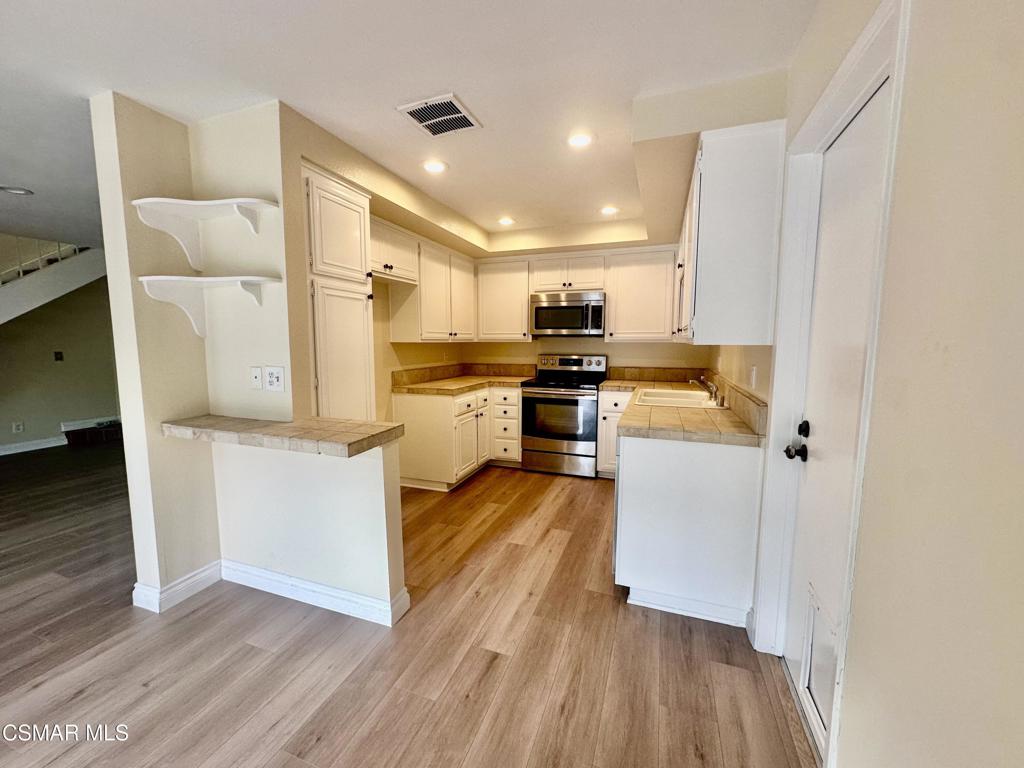 Extremely light-n-bright 2 bedroom + 1.5 bath townhome ideally located in the picturesque Summershore community, adjacent to the Westlake Lake, The Landing restaurants & shops, and hiking trails. Ceramic stone tile entry, NEW laminate floors downstairs, recessed lighting, smooth ceilings, neutral paint. Neutral carpet on 2nd floor. This remodeled unit has a beautiful kitchen with tile counters, freshly-painted white cabinets, stainless steel range and microwave, and lovely designer floors. The dining area has 2 sets of sliding doors that open to a private patio. The large living room features a gas fireplace. The bathrooms are complete with custom vanities with new hardware, updated fixtures, and newer flooring. The primary bedroom features a charming balcony, mirrored closet doors, and recessed lighting. Second bedroom is also flooded with natural light. 2-car attached garage. Enjoy the community pool & spa and greenbelts which lead to a charming waterfall and stream.
