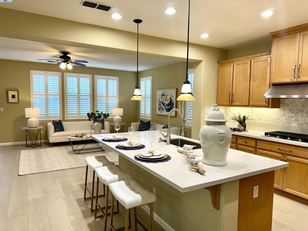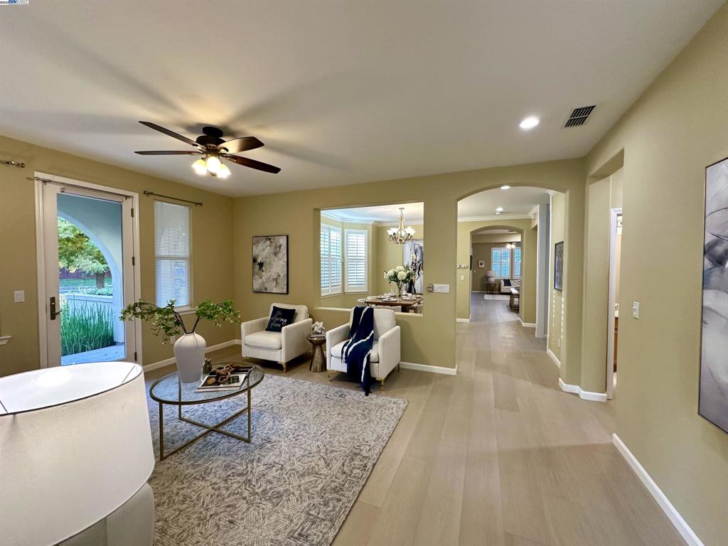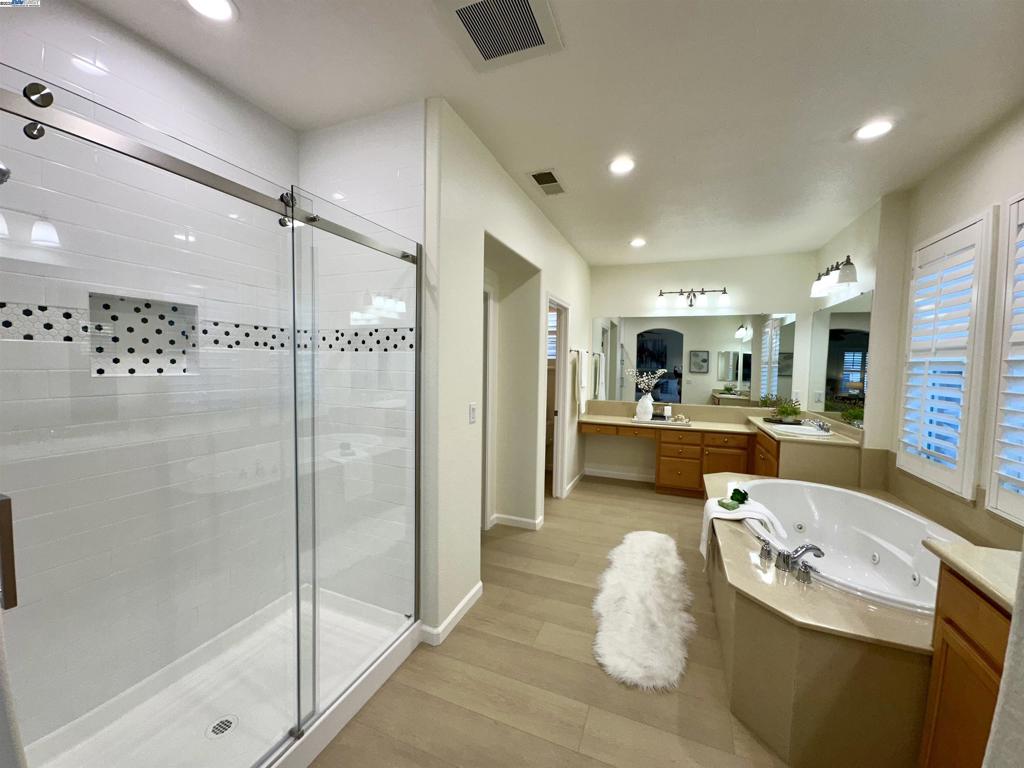 EAST FACING HOME fronting a vibrant walking trail. Wonderful open floor plan, lots of light & space. Bedroom and full bath in the lower level, luxurious primary BR, jacuzzi tub in master bath, huge walk-in closet. All brand new LV Flooring throughout, separate laundry room. Formal Living, Dining and Family Room, gourmet kitchen, quartz counter top with stainless steel appliances, new combo wall oven/microwave, new dishwasher, new range hood, new beverage cooler, newer cooktop stove, large pantry. New ceiling LED lights. Window plantation blinds. Convenient 3-car side by side on this corner lot of 9,562 sq. ft with mature landscaping. Just move-in and have the pride to own this beautiful home. 2AX Model only 5 exists in this Bethany Village charming neighborhood. Great schools, walk to Bethany Elementary and just a little over a mile to Mountain House High School. Delta College is near-by.
