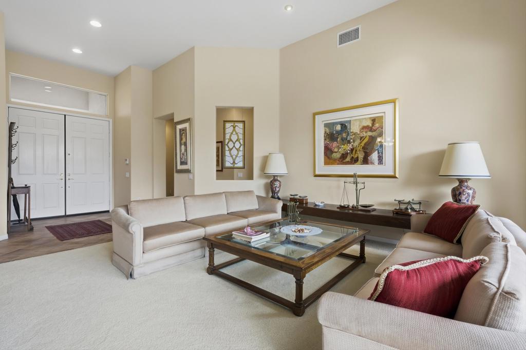 True Pride of Ownership at Sun City Palm Desert! This immaculate Monaco floor plan is 2,323 square feet, with 3 bedrooms and 3 bathrooms. The kitchen has slab granite countertops, oversized island, and is open to the family room. The family room is perfect for entertaining, watching a movie, or just relaxing by the fireplace. The primary suite is spacious and private, with a large walk-in closet, dual sinks, custom seamless shower, and separate jetted bathtub. The attached casita is an enormous guest suite with access out to the entry courtyard. The third bedroom can be used as a guest room or a den/office, with direct access to the guest bathroom. Other features of the home include high ceilings, custom tile work, shutters, central vacuum system, 2 car garage plus golf cart garage. The oversized private backyard faces southeast and offers sun during the early part of the day, and shade in the late afternoon. This home is in move-in ready condition! Sun City Palm Desert is an active 55+ community.