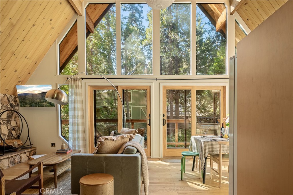 Tucked among the trees just moments from the lake and the charming village of Blue Jay, this beautifully remodeled 1970s A-frame captures everything people love about mountain living—retro character reimagined with a clean, modern spirit. Inside, sunlight filters through iconic triangular windows onto custom cabinetry, quartz countertops and hardwood floors that make the space feel both elevated and effortless. The home can be delivered completely turnkey—offered with its curated furniture and full inventory—so you can getaway, right away. With central A/C, Anderson double-paned windows, a hard-to-find flat lot, seasonal stream and *plenty of privacy*, it’s ideal for outdoor lovers who dream of forest dinners and fireside stories under the stars. Below, a spacious unfinished build-up offers tons of storage plus exciting potential for future expansion– and yes, it has lake rights. Currently a successful short-term rental with an active permit, this home makes the perfect weekend home, full-time retreat, or investment property when life calls you elsewhere.
