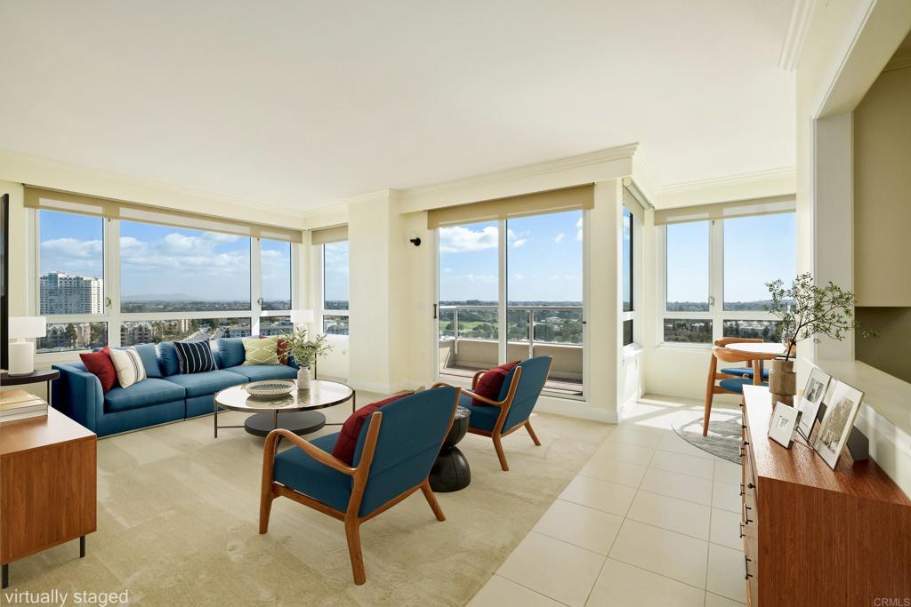 Located in Pacific Regent La Jolla, a premier 62+ community on the border of La Jolla and UTC, this bright 2-bed 2-bath 1,153 sqft corner unit offers unobstructed mountain and city views. This South-East facing home is filled with natural light and features an open floor plan, a spacious living room with a wall of windows and a private balcony. The unit also includes updated bathrooms – one with a soaking tub, the other with a walk-in shower. Plus a full-sized stacked washer & dryer, central AC and heating. Pacific Regent La Jolla has 148 condominiums and offers upscale resort-style living. Amenities include 24/7 concierge and security, weekly 1-hr housekeeping service, a heated indoor pool and spa, an on-site gourmet restaurant, a fitness center, a library, a beauty salon, and an outdoor lounge. Residents enjoy a full calendar of activities, from book clubs and movie nights to beach walks and cultural outings. Additional conveniences include 3 residential elevators, a private parking garage with EV charging stations, complimentary valet parking for residents and guests and scheduled transportation to medical centers, markets and local attractions. Monthly HOA dues cover all utilities, dining credits, high-speed internet, cable TV, landline service, water, trash and common area maintenance. Ideally located in one of San Diego’s most desirable neighborhoods, Pacific Regent La Jolla is just minutes away from the UCSD medical campus, UTC shopping center, the Blue Trolley line and the beautiful La Jolla beaches. It also offers quick access to the 805 and 5 freeways.