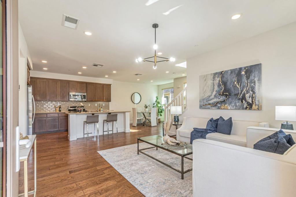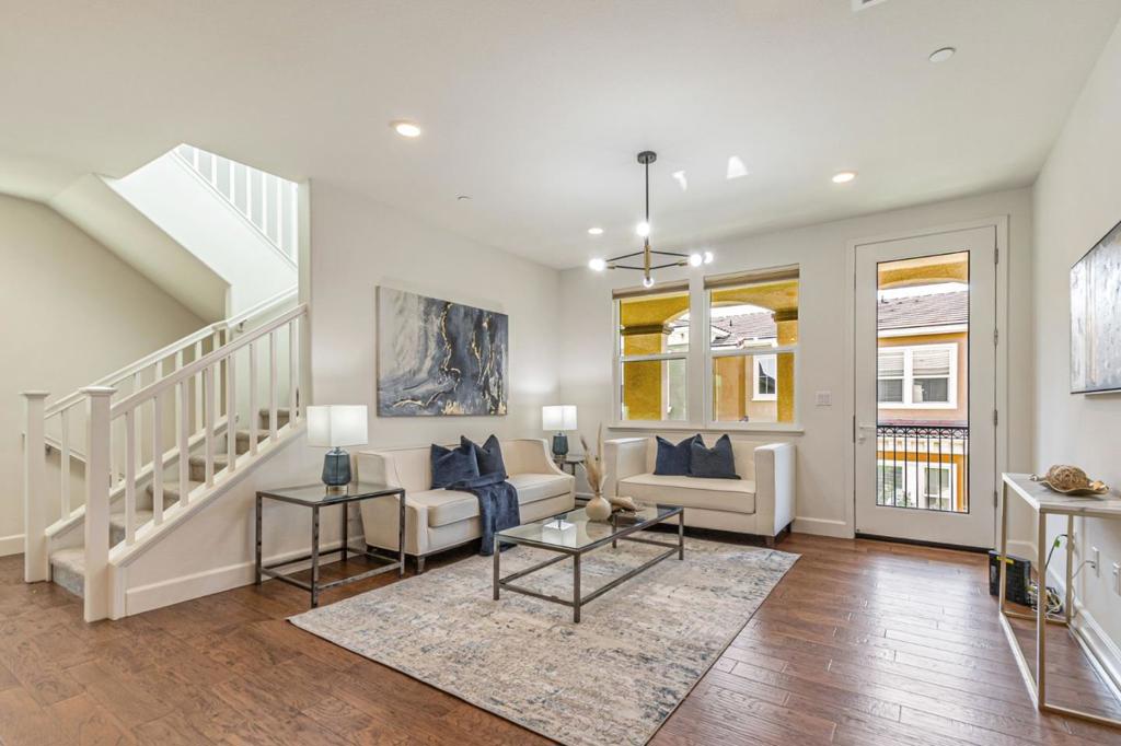 Corner lot! East facing. This stunning 3-bedroom, 3-full bathroom home is situated in a prima community in Newark, featuring a highly desirable location w/ no rear neighbors & a beautiful, amazing view of the sunrise. The home offers an open concept layout & high ceilings, with 1 bedroom/ 1 full bath on the main level. Tasteful upgrades are found throughout, including a chef-grade kitchen w/ custom white shaker cabinets, modern full mosaic tile backsplash, granite countertops, high-end SS appliances, and a supersize island. The formal dining area & private balcony are perfect for entertaining. Beautiful engineered hardwood floors adorn the main level. New paint and new light fixture in the living room. Central AC and heating provide comfort year-round. The primary suite boasts a spacious walk-in closet & double sink vanities, offering a luxurious & relaxing experience. The location is highly convenient, just a few minutes’ walk to BJs Restaurant, AMC, Costco, and New Park Mall, w/ easy access to Freeway 880 & BART. It’s also within walking distance to company commute bus stops and Starbucks, and close to the desirable Challenger School & park. Easy access to Facebook and all major tech companies makes this home even more appealing. Gated community & no rental restriction.