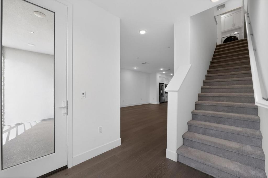 Modern Tri-level Townhome Located in Hayward, excellent commuter location. One bedroom and full bathroom on ground level. Beautiful kitchen with gas, microwaved, refrigerator, pantry and counter height island perfect for social/family gatherings. Family room/dining area leads to great balcony overlooking walking trails. Primary bedrooms and bath suite offers double sink vanity and walk in closet. Flooring consists of laminate in main living areas, plus carpeting in bedrooms and tile in bathrooms. Two car garage with EV parking included solar panels offer energy savings. Show by appointment only!