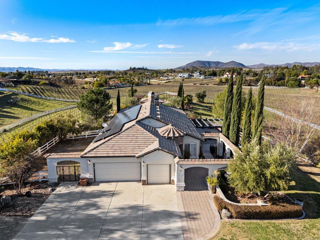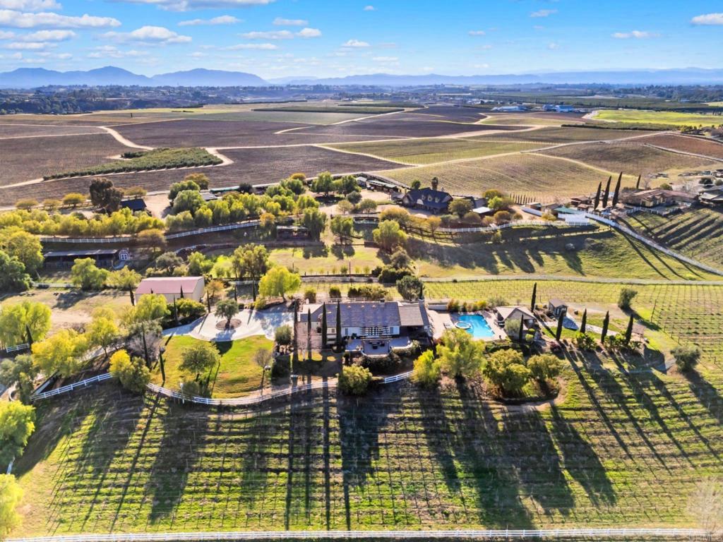 $136,000 Price Drop!! Come experience wine country living at its finest with this breathtaking Wine Country Luxury Vineyard Estate spanning 5.39-acres. Perfectly perched on a bluff in the heart of Temecula Wine Country. Surrounded by walkable award-winning wineries, rolling hills, and stunning sunset views, this exclusive retreat offers an unparalleled blend of elegance and tranquility. Step inside this beautifully designed 3-bedroom, 2-bathroom home, where an open-concept floor plan welcomes you with refined finishes and effortless indoor-outdoor flow. The gourmet chef’s kitchen, complete with top-tier appliances and an oversized island. This home is perfect for entertaining, a small private wedding, fun get togethers or enjoying a glass of your own estate-grown Cabernet Sauvignon. Outside you will find a sprawling covered patio with a grand stone fireplace for unforgettable evenings, overlooking your very own 3800 Cabernet Sauvignon vines, a resort-style 40,000-gallon pool, and spa along with a fully covered outdoor living room complete with built in bbq. A private vineyard-side studio offers endless possibilities—art retreat, meditation room among the vines, or office—while the 40×50 barn with a climate-controlled “wine room” adds to the estate’s exceptional amenities. Equipped with solar power and agricultural water rates, this estate is as sustainable as it is stunning. Wake up to hot air balloons floating overhead, sip wine by sunset, and embrace the magic of vineyard living in this one of a kind dream property.