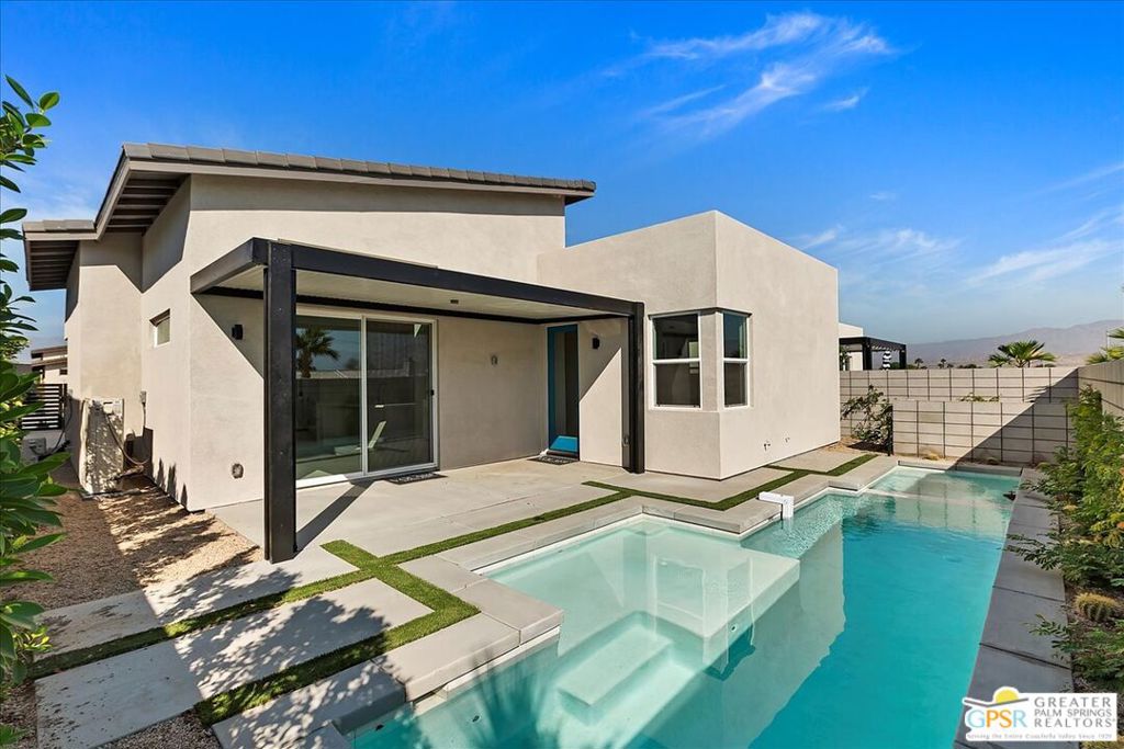 This is an upgraded modern single-story residence with 1,738 sq. ft. of living space featuring 3 Bedrooms ,one of which is Detached, and 3 Baths. With 12-foot ceilings in the Great Room, Dining, and Kitchen, amplifying the sense of space. The chef’s kitchen is equipped with top-of-the-line appliances, sleek cabinetry, and a spacious island. The 3 Bedrooms are designed for comfort and privacy. The 3 Baths embody contemporary fixtures and finishes. The inclusion of a Lifestyle pool and spa transforms the home into a haven of relaxation and enjoyment along with a covered Patio providing an ideal space to unwind or to enjoy an afternoon, The Gated Entry ensures your security and privacy. The 2-Car Garage comes equipped with EV conduit The energy efficient Solar System is also included in the purchase price.