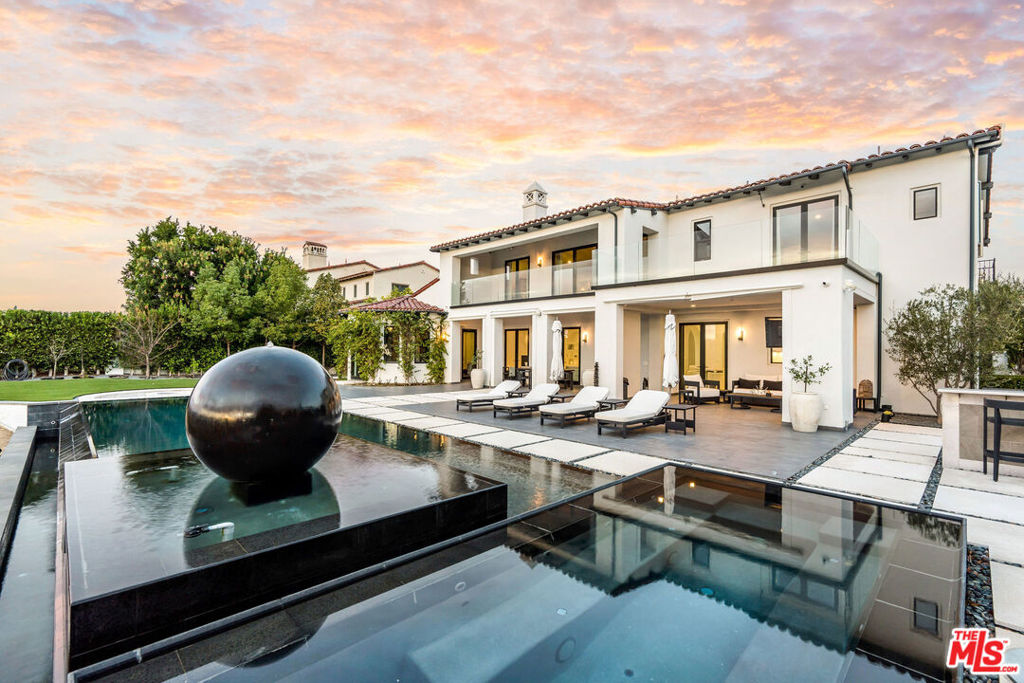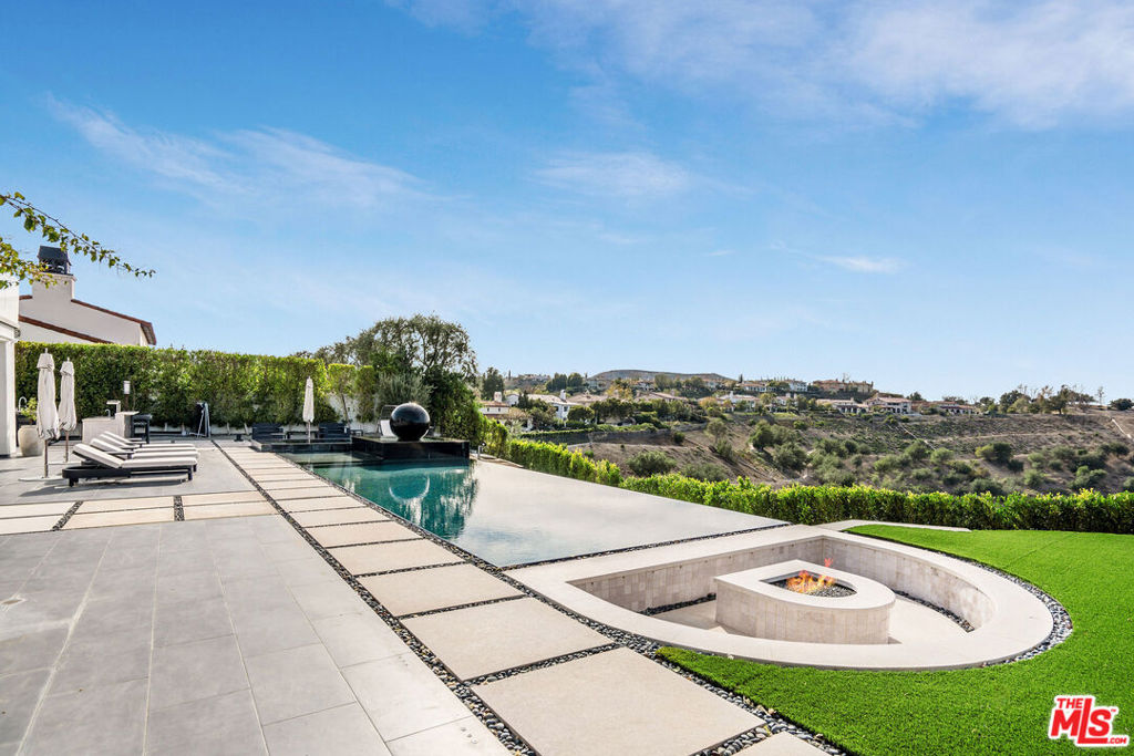 Beyond the guard gates at The Oaks at Calabasas lies an extraordinary pedigree of luxury and style, set on a premier view lot with endless horizons. This notable Laing Luxury Model 2 estate has been reimagined with an elevated organic modern aesthetic, blending minimal sophistication with exceptional designer finishes. Nearly 7,000 square feet of contemporary luxury, this home showcases a brand-new kitchen with custom cabinetry, exquisite Taj Mahal slabs, a striking waterfall island, and beautiful finishes. Modern stone flooring flows throughout the main level, while timeless French oak hardwood graces the second floor. The expansive living room features a custom focal fireplace wall, seamlessly open to the formal dining space and an elegant bistro patio. The generously sized family room connects effortlessly to the kitchen and breakfast dinette, creating an inviting and functional living space. A dedicated bonus room is fully equipped with an incredible home theater and pool table, offering the perfect space for entertainment. Five ensuite bedrooms include one on the main level, while the grand primary suite is a tranquil retreat. The newly designed primary spa bath is a masterpiece, featuring an oversized shower with chevron-pattern stone finishes, floating vanities, ambient lighting, and a pedestal tub. The large custom walk-in closet is both spacious and functional, designed for ultimate convenience. Step outside into a resort-style paradise, where breathtaking views set the stage for an exceptional outdoor experience. The zero-edge infinity pool and spa seamlessly blend with the horizon, while a sunken fire pit seating area at water level creates the ultimate modern luxury ambiance. Every detail of this estate has been thoughtfully curated to embody both moody elegance and contemporary sophistication.