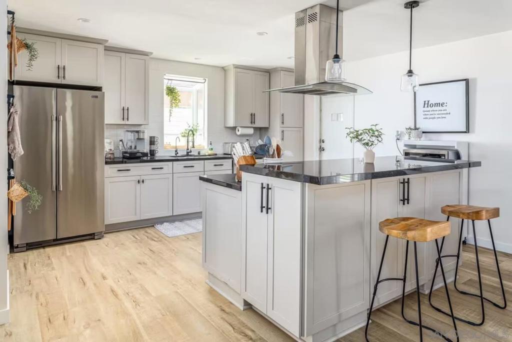 Beautiful single-story home with paid-off solar and a fully equipped attached PERMITTED ADU! The main house offers 3 bedrooms and 2 bathrooms with an open, inviting floor plan and tasteful upgrades throughout. The kitchen features granite countertops, stainless steel appliances, a professional-grade vent hood, bar-height counter, and plenty of natural light. Hardwood and laminate flooring extend throughout, complemented by skylights and recessed lighting for a bright interior. The ADU includes 1 bedroom, 1 bath, a full kitchen, laundry, and its own gated entrance, making it perfect for guests, multigenerational living, or added rental income. Both units are currently active short-term rentals with solid booking histories and excellent reviews. The permitted covered patio extends the roofline, creating a perfect year-round entertaining space. The backyard features turf and pavers with separate fenced yards for each unit and no neighbors to the rear for added privacy. Additional highlights include air conditioning in both units, a 2-car garage with direct kitchen access, a fully fenced lot with vinyl and black fencing, and no HOA or Mello Roos. Ideally located just off the 805 at Balboa, within 10 miles of five Level 1 trauma centers, 5.5 miles to Pacific Beach and Mission Bay, 3 miles to SeaWorld, 5 miles to the airport, and 2 miles to USD and Mesa College. Bright, clean, upgraded, and move-in ready—this home offers flexibility, comfort, and unbeatable convenience in the heart of San Diego.