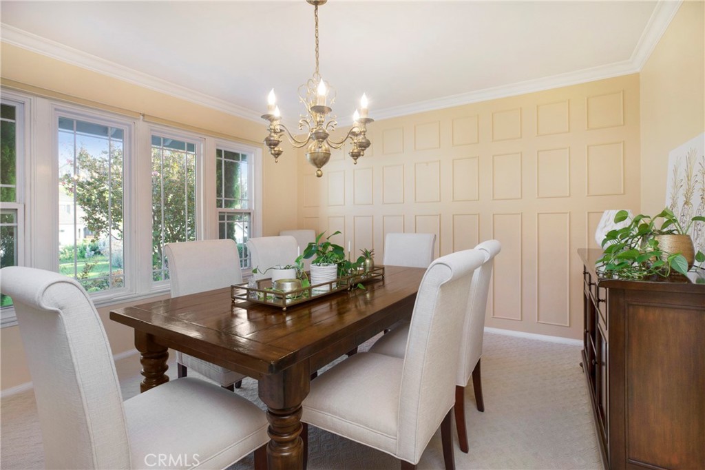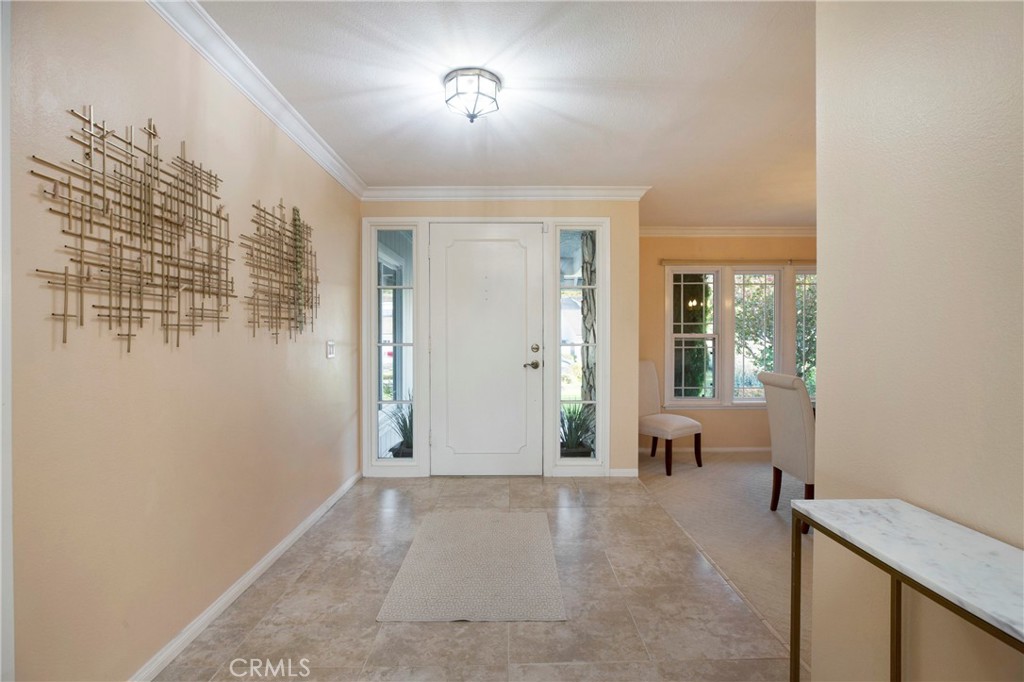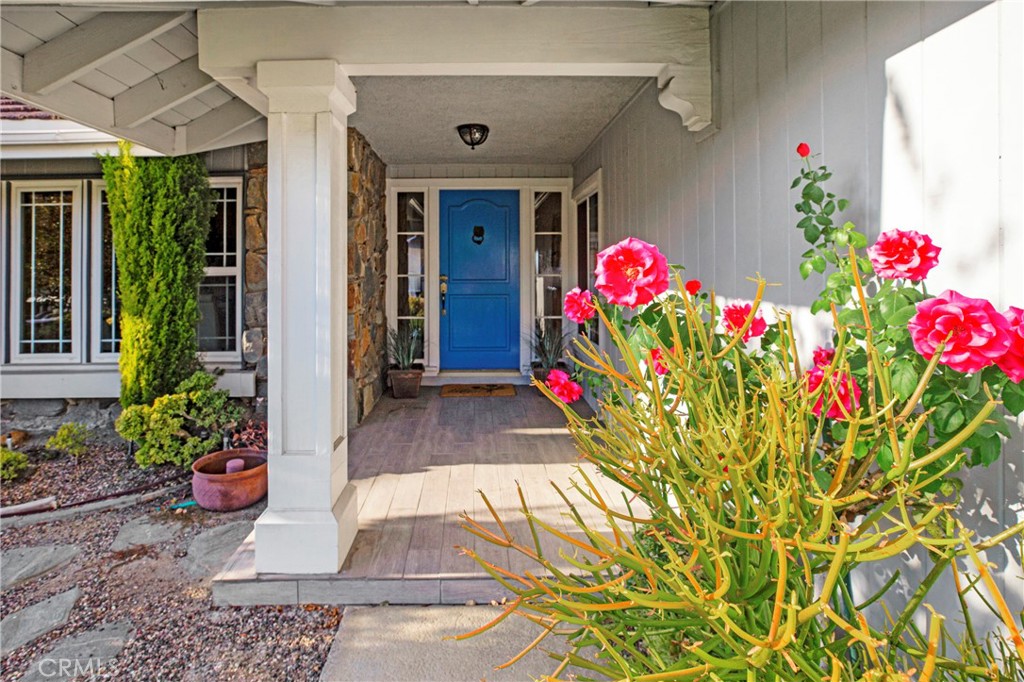 There’s no place like home which is just how you’ll view this stylishly sleek yet pleasantly inviting house. Located in Anaheim Hills, it’s graceful wide steps create a gracious welcoming walk to the front door. Once inside, the roomy, light-filled foyer leads to 2380 sq. ft. of high ceilings, crown molding, built in’s, architectural windows, and tile/carpet flooring. A spacious and well-designed white kitchen provides plenty of preparation, cook, counter, even serving space. The open concept design allows smooth flow to an adjacent dining area then into a cozy hang out section complete with fireplace. A separate dining area allows for larger more intimate gatherings. Three bedrooms and two baths plus another large loft-like living space that overlooks the neighboring hills and scenery also await. A spacious primary bedroom has a large ensuite with oversized counter space, dual sinks and cabinets, luxurious soaking tub, separate shower, and elegant gold fixtures. The second bath likewise has extra countertop space along with dual sinks. Mirrored closets throughout attractively add to the home’s light, fresh, clean look. Having a laundry area and bonus space are yet more features. Outside, the mature manicured lawn and landscaping lend an elegance and well kept look. A large covered patio with pavers completes the beauty and functionality of this property.