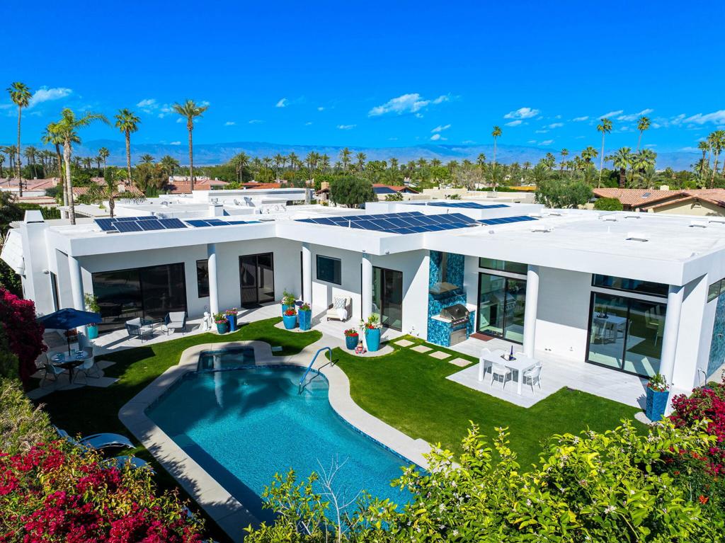 A Modern Sanctuary with Panoramic Views in Indian WellsOffered Fully Remodeled and Designer-FurnishedPerched along one of Indian Wells’ most desirable streets, this architecturally reimagined residence offers uninterrupted vistas of Eisenhower Mountain and the surrounding ranges from nearly every room. The home presents a harmonious blend of clean-lined contemporary design and refined comfort, crafted through a meticulous collaboration between architect and interior designer.This four-bedroom, four-bathroom property features a seamless indoor-outdoor flow, where thoughtful design maximizes natural light, privacy, and tranquility. The gourmet kitchen is equipped with a premier appliance suite, complemented by white cabinetry and a generous walk-in pantry. Each bathroom is uniquely appointed with distinctive blue tilework, offering a cohesive yet individual aesthetic throughout.Outdoors, a lushly landscaped backyard sets the tone for elevated desert living–complete with a pristine pool and spa, built-in BBQ, and outdoor shower. The oversized garage with epoxy flooring and built-in storage enhances the property’s practical appeal, while two solar systems contribute to sustainability and energy efficiency.Every space within the home is purposefully considered, from the elegantly appointed guest suites–each with a private bath–to the serene owner’s suite, all oriented to capture breathtaking mountain views. Whether hosting guests or enjoying a quiet morning coffee, the atmosphere remains one of serene luxury and effortless sophistication.Offered with all new systems, furnishings, and finishes, this is a rare opportunity to own a turnkey property of architectural and aesthetic excellence in Indian Wells.